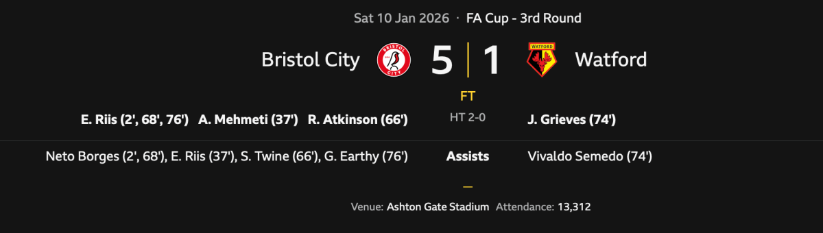Match Report: Watford out of the FA Cup after 5-1 Bristol City hammering