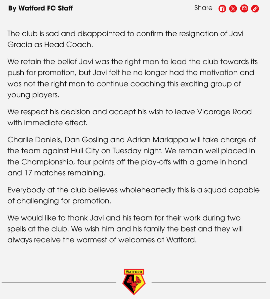 Watford Observer: Javi Gracia resigns as Watford head coach