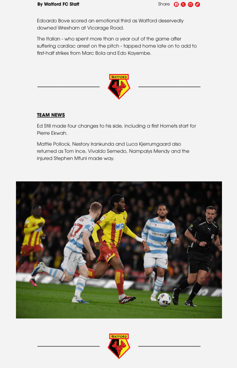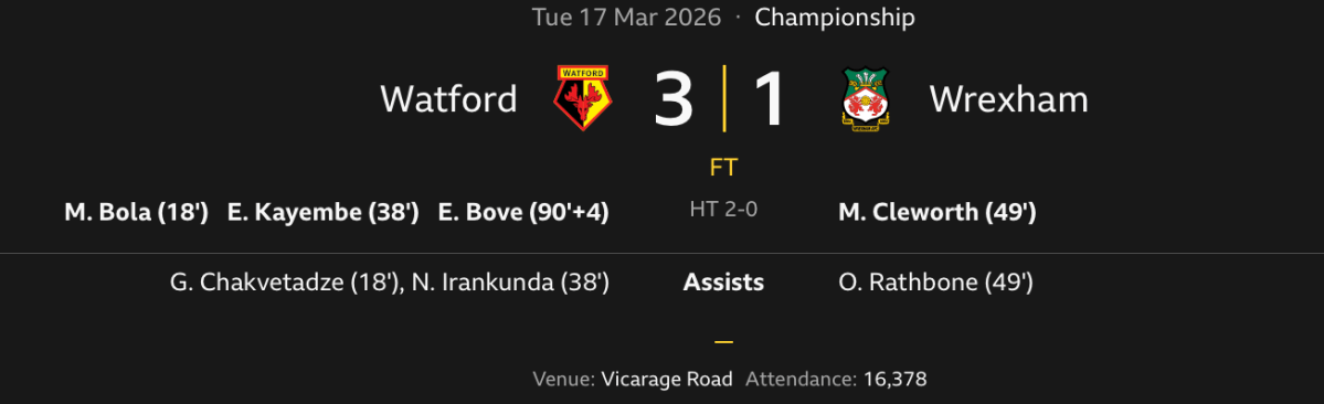 Match Report: Bove seals the deal as Watford bounce back to beat Wrexham 3-1