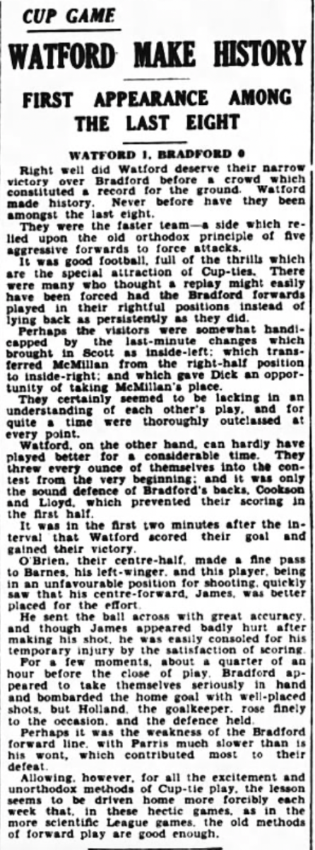 13th February 1932-FA Cup Fifth Round, Watford 1 Bradford (Park Avenue) 0 Leave a Reply This was the first time we had reached the Sixth Round. Sunday Dispatch, 14 Feb 1932 Sunday People, 14 Feb 1932 Sunday Mirror, 14 Feb 1932 Share this: Share on X (Opens in new window) X Share on Facebook (Opens in new window) Facebook