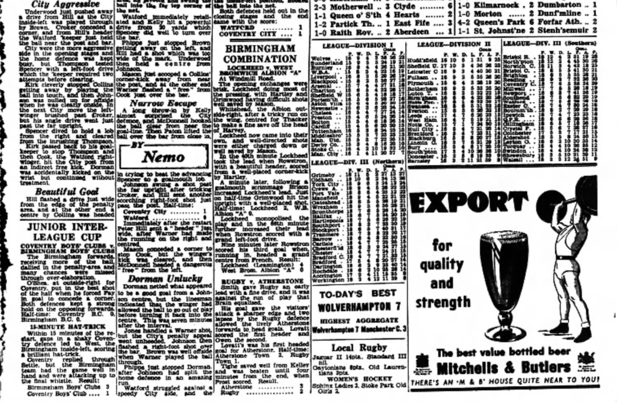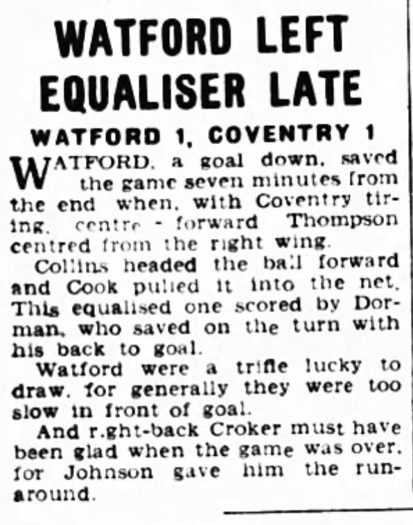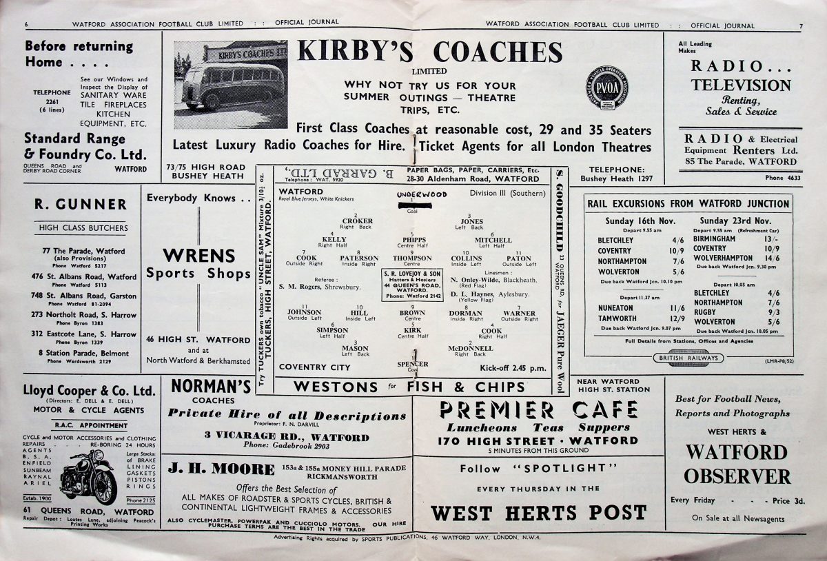 8th November 1952- Division Three (South), Watford 1 Coventry City 1 Programme images courtesy of Matt Hall https://watford.fcdb.info/index.php?page=matches Coventry Evening Telegraph, 8 Nov 1952 Sunday Dispatch, 9 Nov 1952 Sunday People, 9 Nov 1952 Sunday Mirror, 9 Nov 1952 Sunday Mirror, 9 Nov 1952 Share this: Share on X (Opens in new window) X Share on Facebook (Opens in new window) Facebook