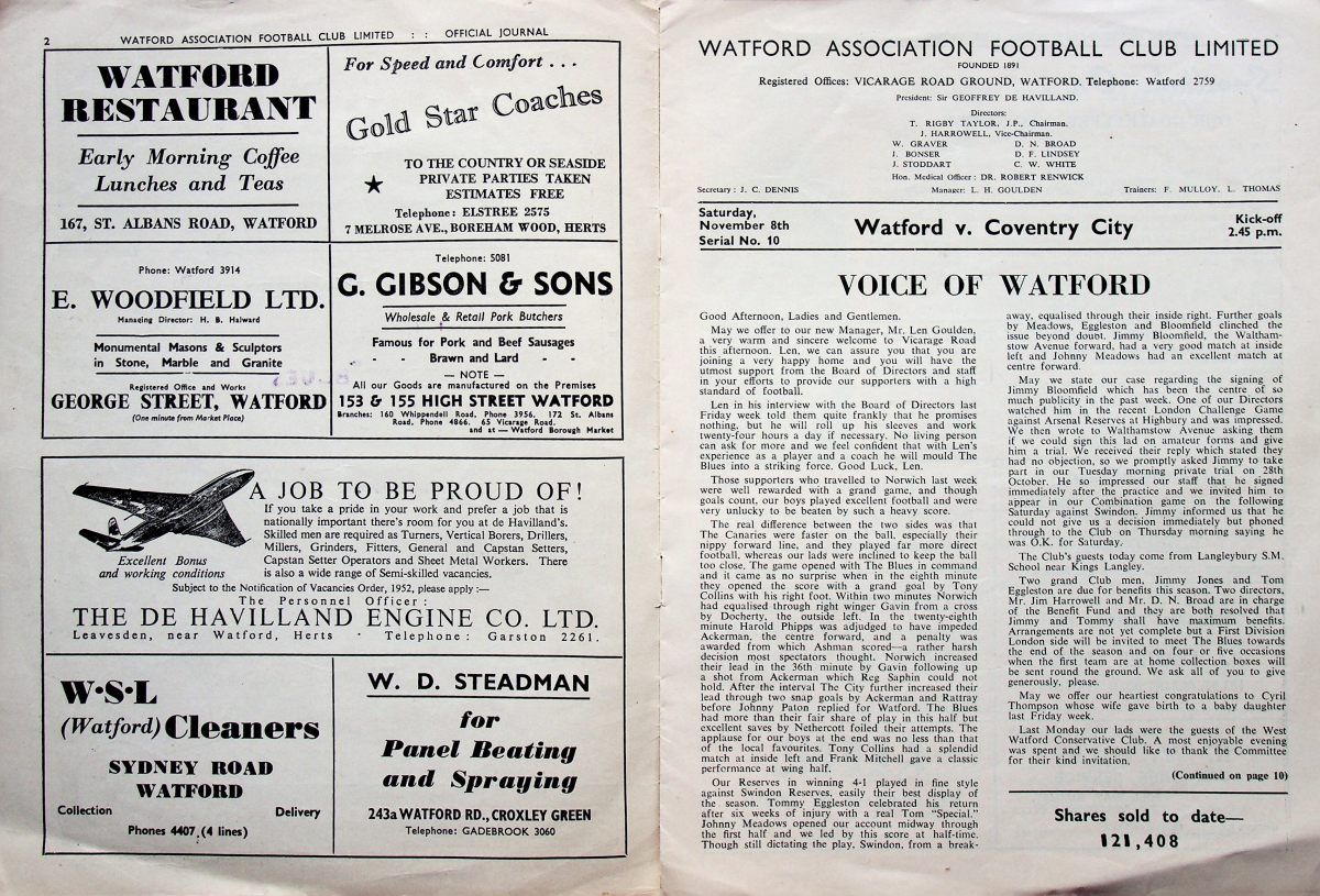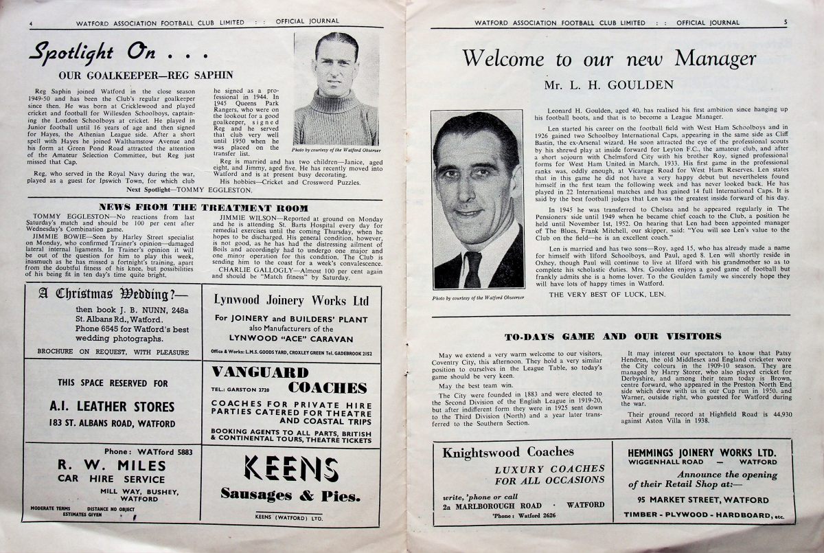1st November 1952- Len Goulden appointed Watford manager Evening Standard, 1 Nov 1952 Share this: Share on X (Opens in new window) X Share on Facebook (Opens in new window) Facebook