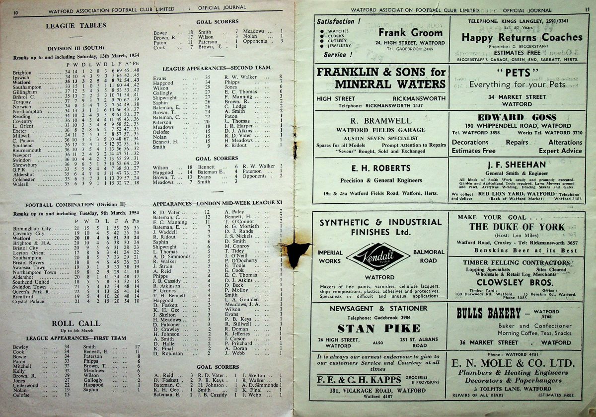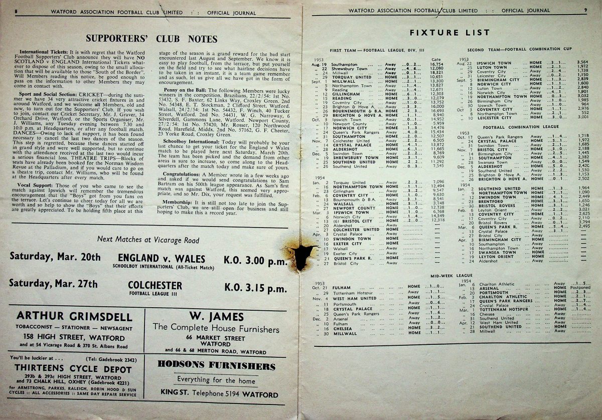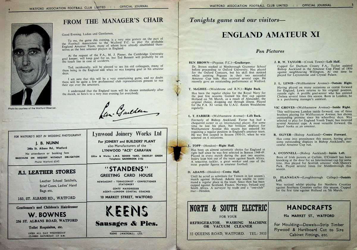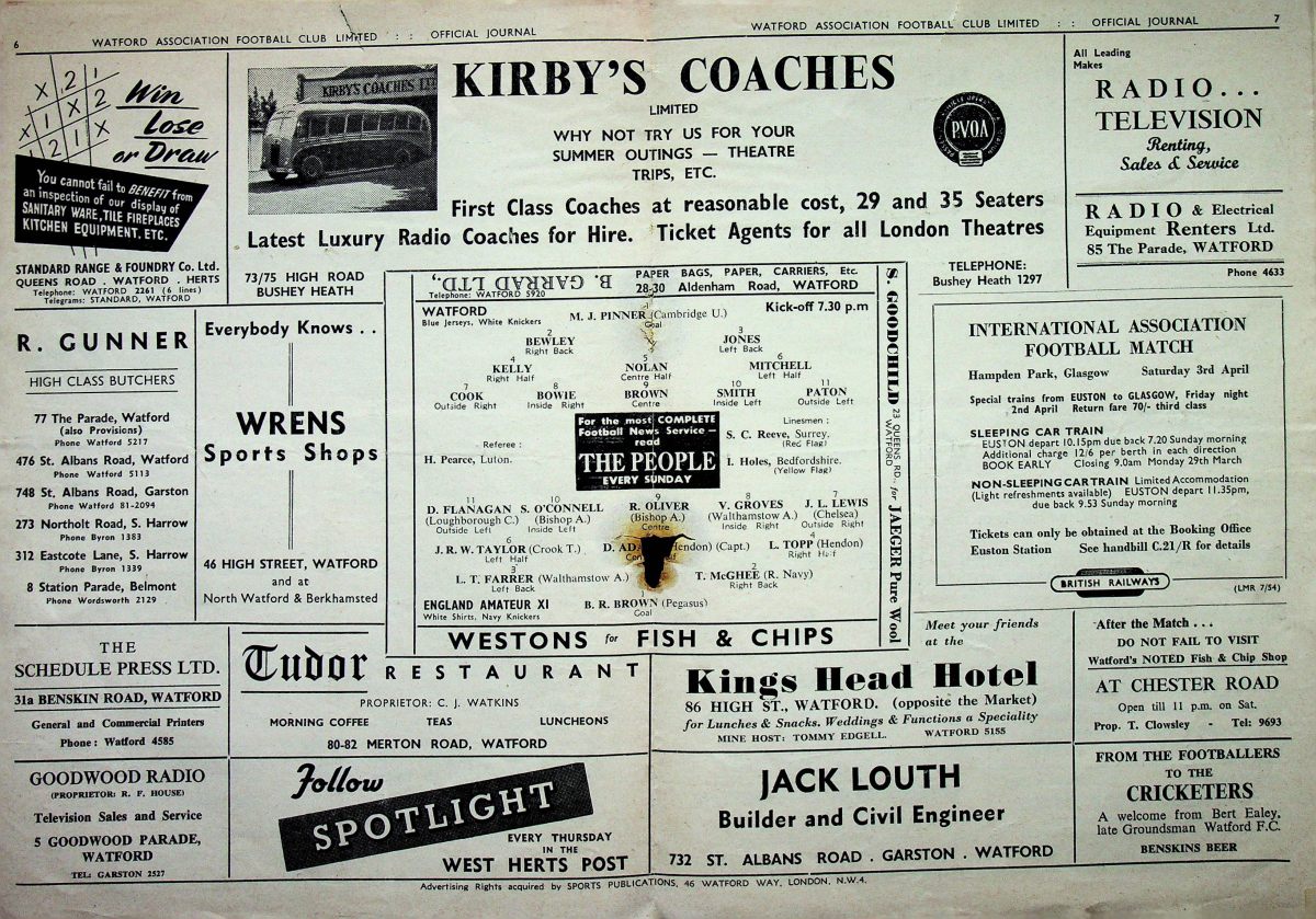 15th March 1954- Friendly, Watford 2 England Amateur XI 1 Programme images courtesy of Matt Hall https://www.watfordfcarchive.co.uk/fixture/1954-03-15 Liverpool Daily Post, 16 Mar 1954 Share this: Share on X (Opens in new window) X Share on Facebook (Opens in new window) Facebook
