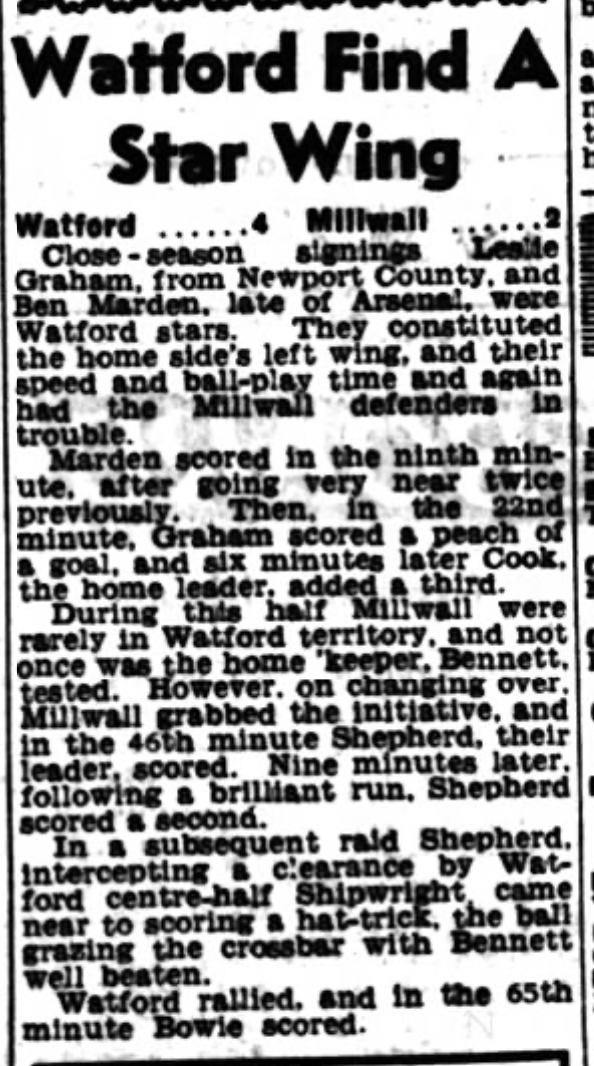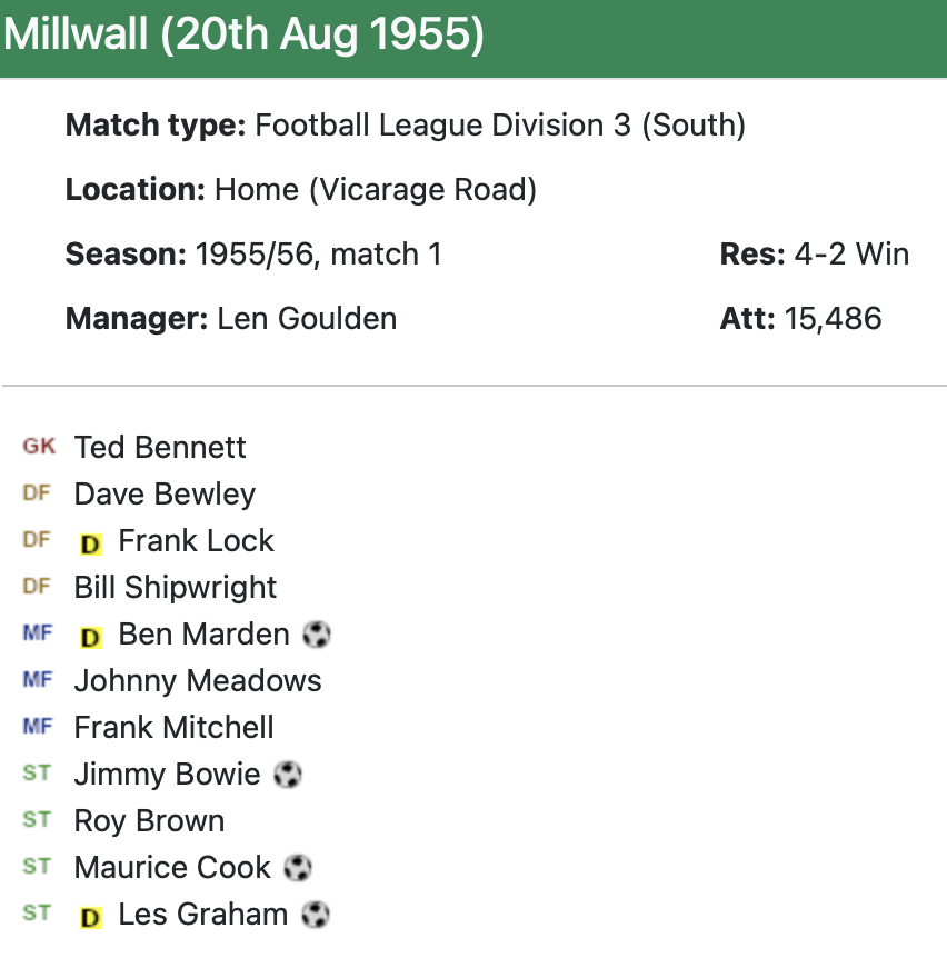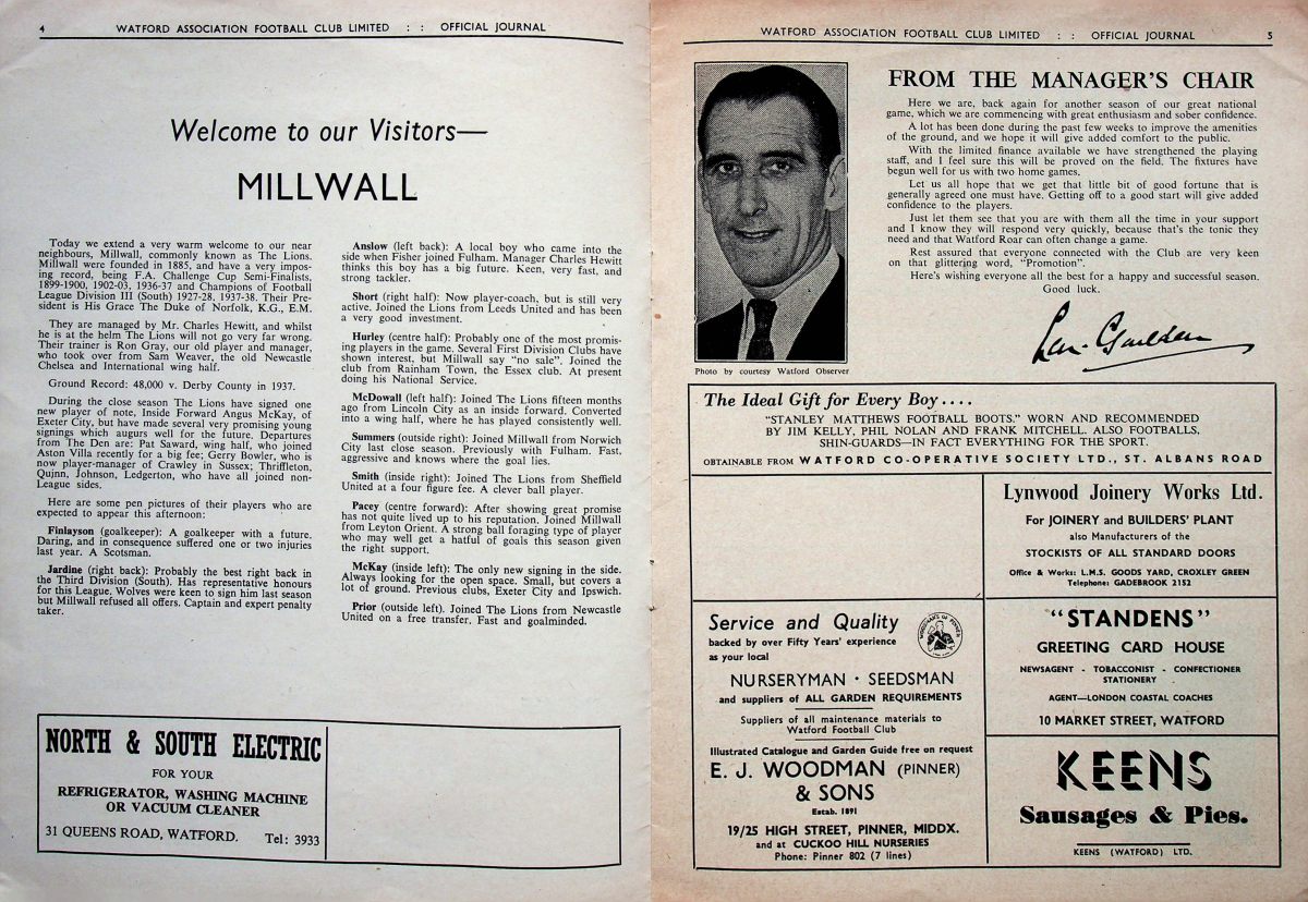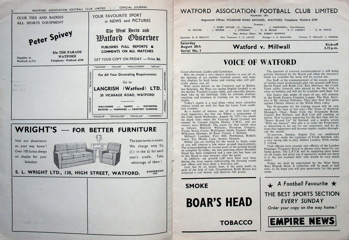 20th August 1955- Division Three (South), Watford 4 Millwall 2 Programme images courtesy of Matt Hall https://watford.fcdb.info/index.php?page=matches Evening Standard, 20 Aug 1955 Sunday Dispatch, 21 Aug 1955 Sunday People, 21 Aug 1955 https://watford.fcdb.info/index.php?page=matches Share this: Share on X (Opens in new window) X Share on Facebook (Opens in new window) Facebook