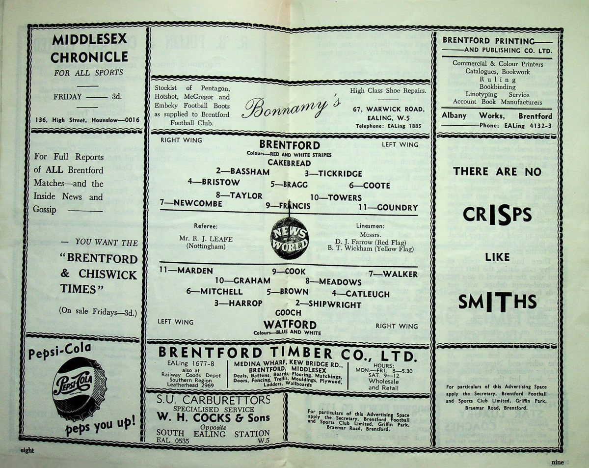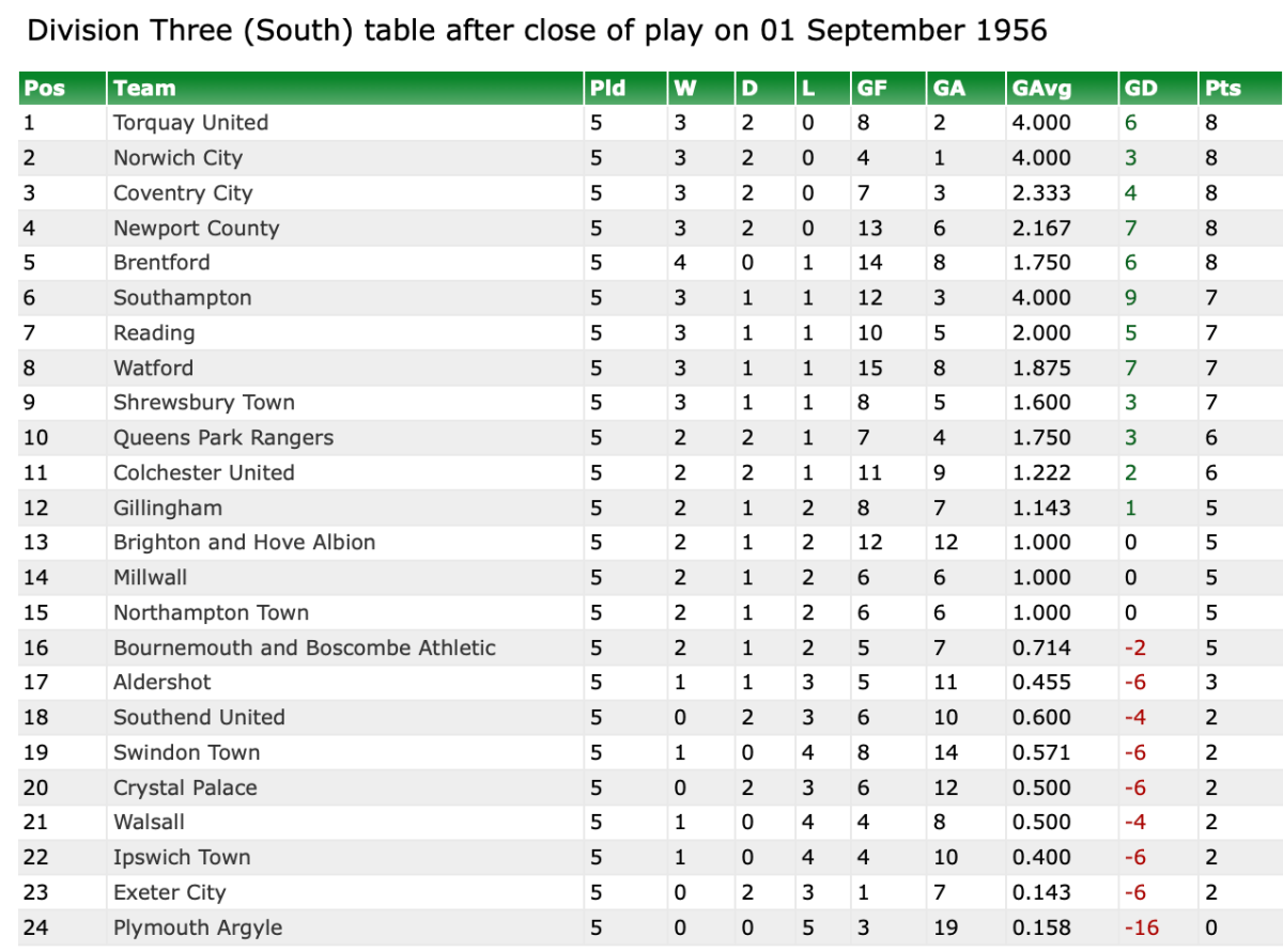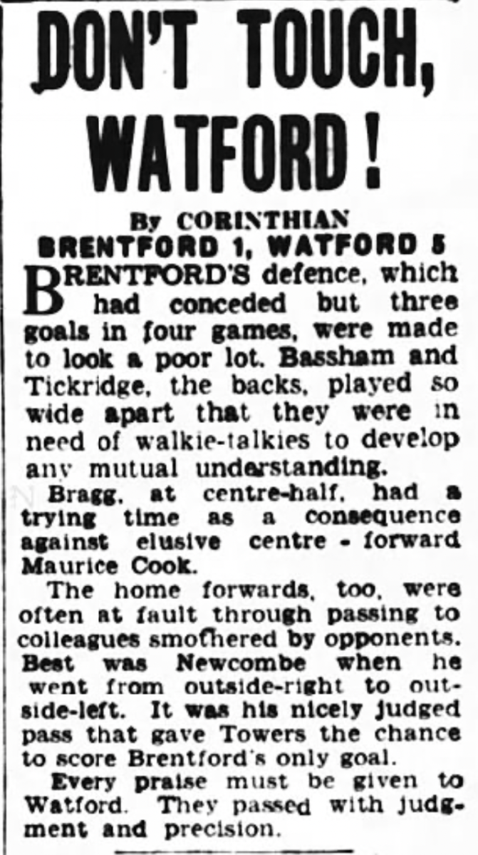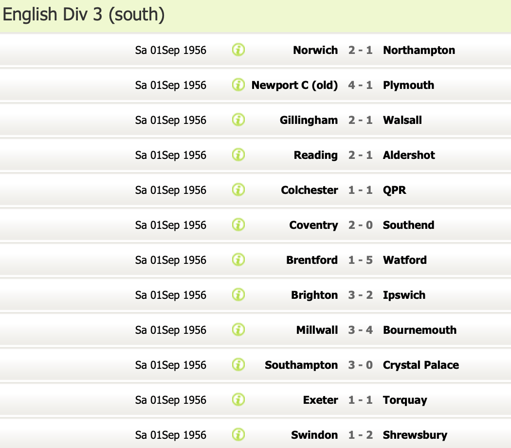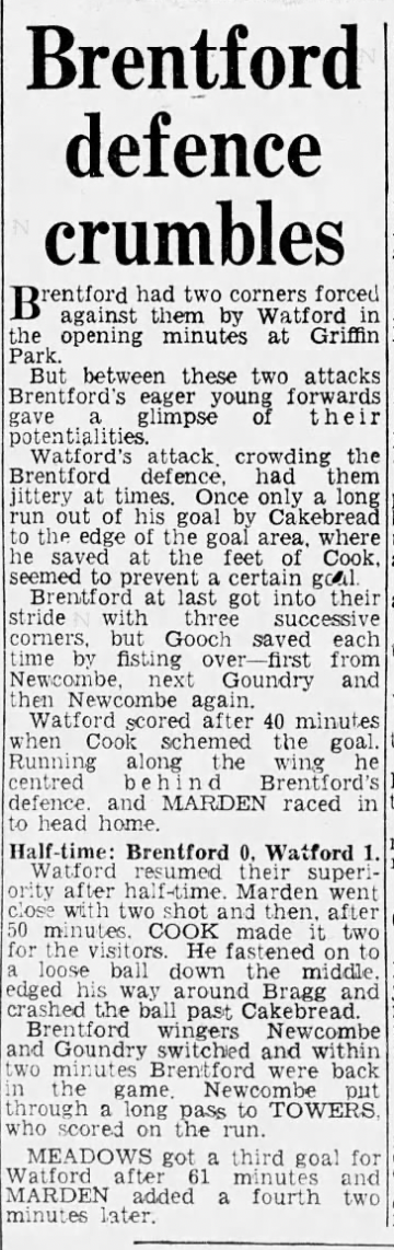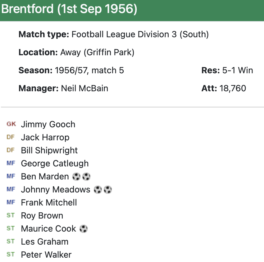 1st September 1956- Division Three (South), Brentford 1 Watford 5 https://watford.fcdb.info/index.php?page=matches Evening Standard, 1 Sep 1956 Sunday People, 2 Sep 1956 https://www.soccerbase.com/matches/results.sd?date=1956-09-01 https://www.11v11.com/league-tables/division-three-south/01-september-1956/ Share this: Share on X (Opens in new window) X Share on Facebook (Opens in new window) Facebook