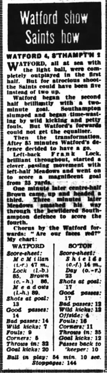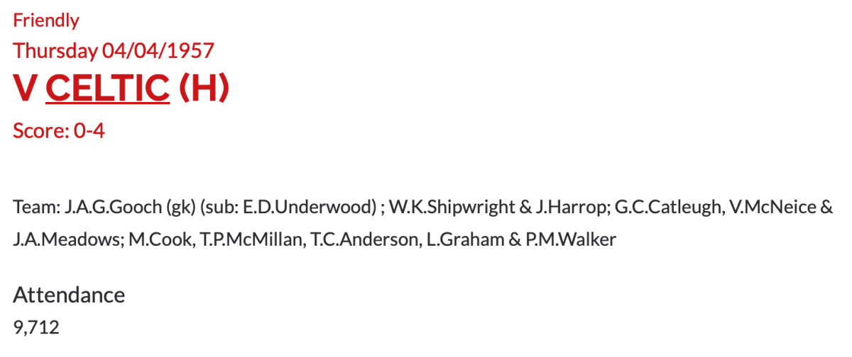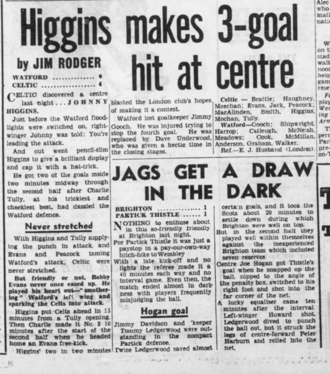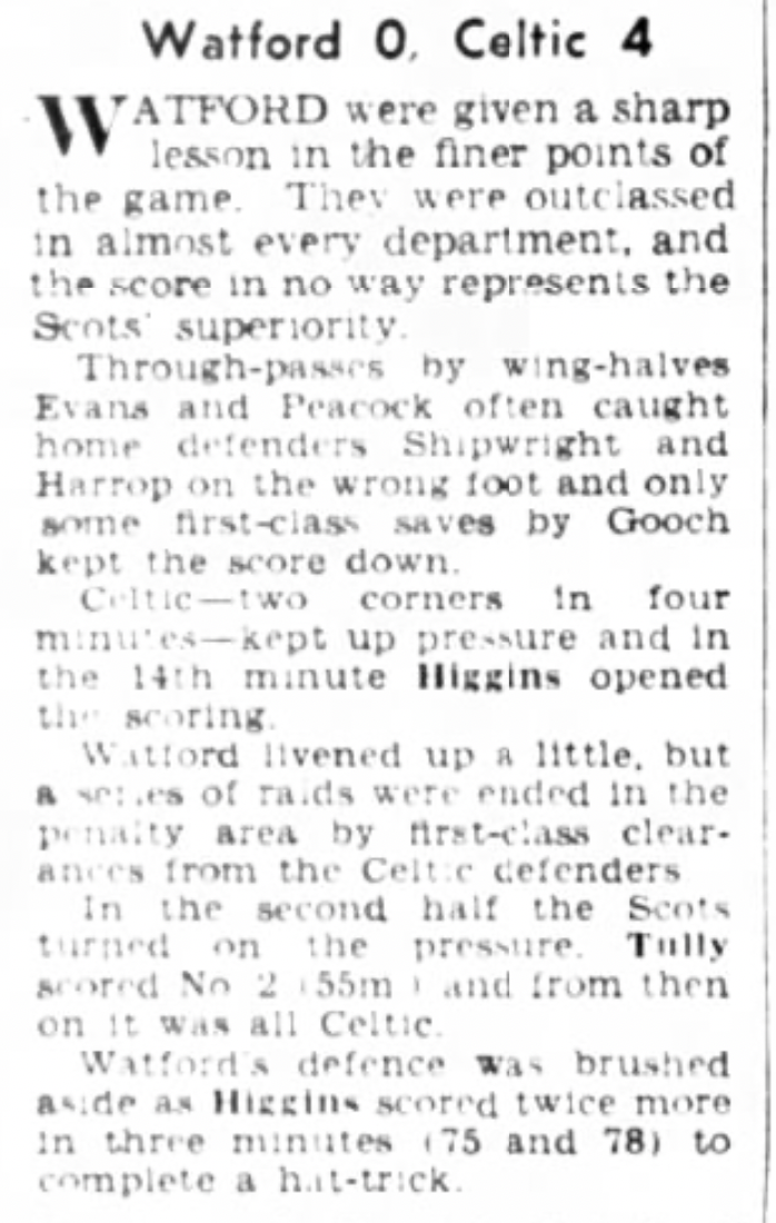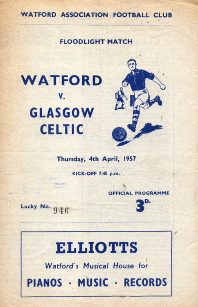 4th April 1957- Friendly, Watford 0 Glasgow Celtic 4 https://www.watfordfcarchive.co.uk/fixture/1957-04-04 Daily Herald, 5 Apr 1957 Daily Record, 5 Apr 1957 Celtic Wiki feature Share this: Share on X (Opens in new window) X Share on Facebook (Opens in new window) Facebook
