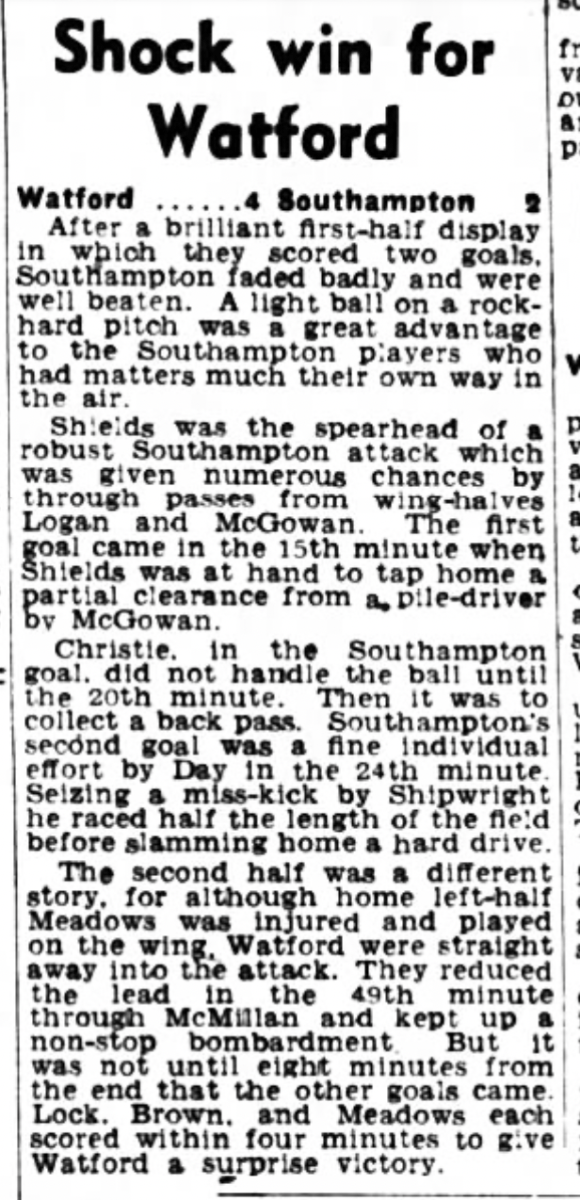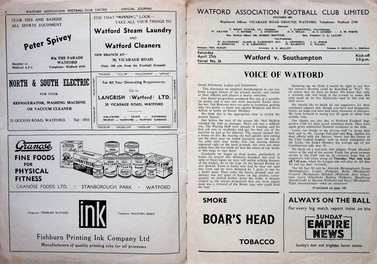27th April 1957- Division Three (South), Watford 4 Southampton 2 https://watford.fcdb.info/index.php?page=matches Programme images courtesy of Matt Hall Sunday People, 28 Apr 1957 Sunday Dispatch, 28 Apr 1957 Sunday Mirror, 28 Apr 1957 Share this: Share on X (Opens in new window) X Share on Facebook (Opens in new window) Facebook
