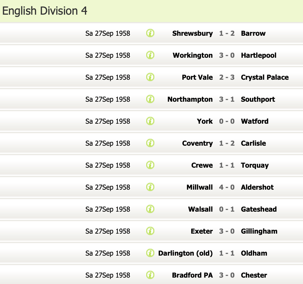 27th September 1958- Division Four, York City 0 Watford 0 https://watford.fcdb.info/index.php?page=matches Evening Standard, 27 Sep 1958 Sunday Dispatch, 28 Sep 1958 Sunday People, 28 Sep 1958 https://www.soccerbase.com/matches/results.sd?date=1958-09-27 https://www.11v11.com/league-tables/league-division-four/27-september-1958/ Share this: Share on X (Opens in new window) X Share on Facebook (Opens in new window) Facebook
