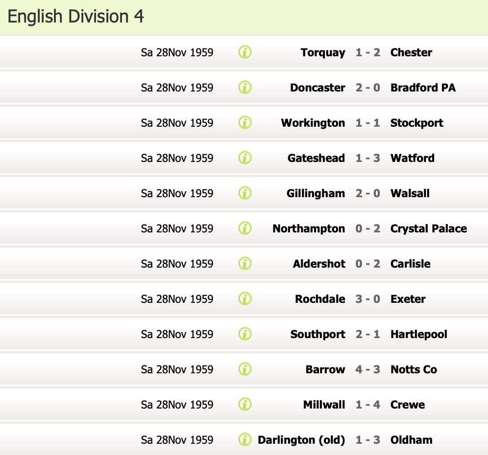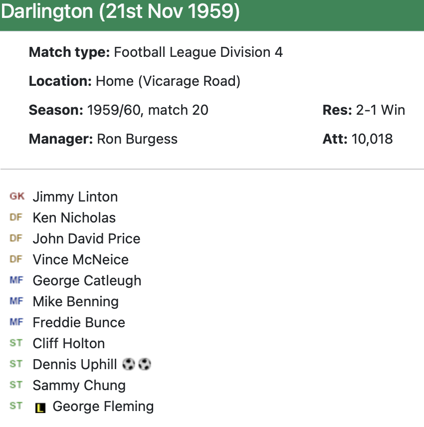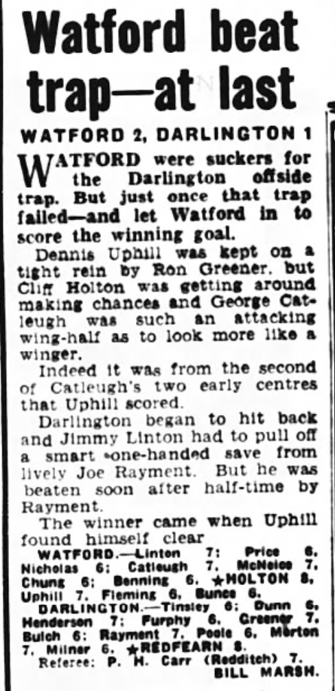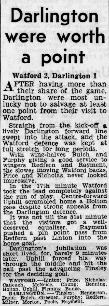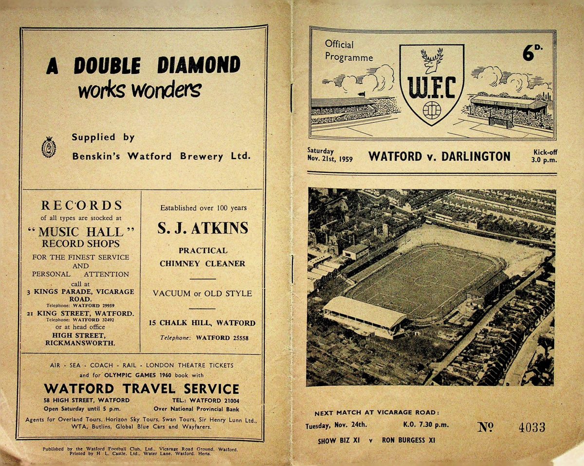 21st November 1959- Division Four, Watford 2 Darlington 1 http://watford.fcdb.info/index.php Sunday Sun, 22 Nov 1959 Sunday People, 22 Nov 1959 Watford Observer match report https://www.soccerbase.com/matches/results.sd?date=1959-11-21 https://www.11v11.com/league-tables/league-division-four/21-november-1959/ Share this: Share on X (Opens in new window) X Share on Facebook (Opens in new window) Facebook