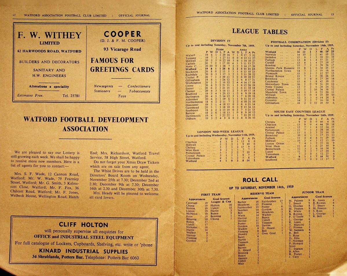 21st November 1959- Football Combination, Northampton Town Reserves 1 Watford Reserves 5 Watford Observer match report Share this: Share on X (Opens in new window) X Share on Facebook (Opens in new window) Facebook