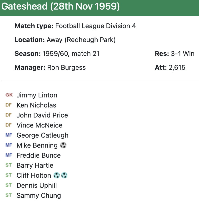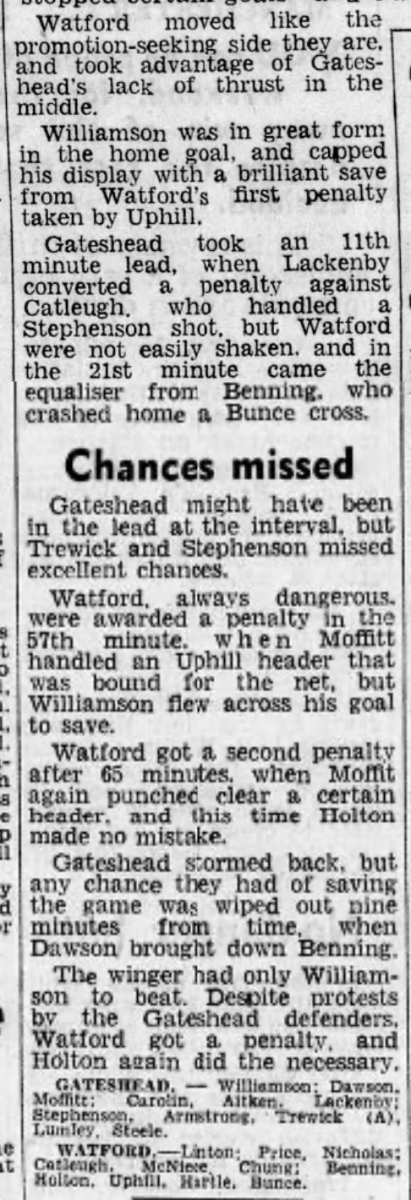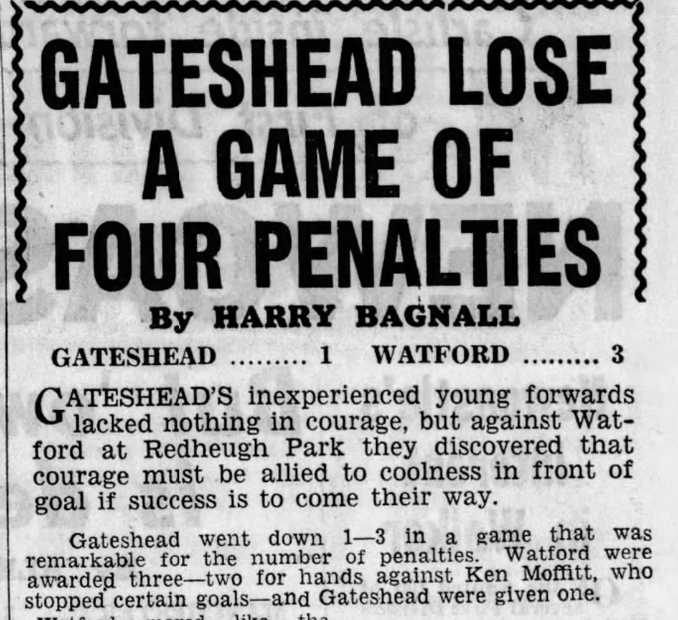 28th November 1959- Division Four, Gateshead 1 Watford 3 http://watford.fcdb.info/index.php Sunday Sun 29 Nov 1959 Sunday People, 29 Nov 1959 Watford Observer match report https://www.soccerbase.com/matches/results.sd?date=1959-11-28 https://www.11v11.com/league-tables/league-division-four/28-november-1959/ Share this: Share on X (Opens in new window) X Share on Facebook (Opens in new window) Facebook