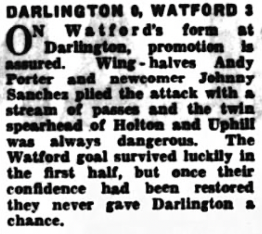 9th April 1960- Division Four, Darlington 0 Watford 3 Leave a Reply http://watford.fcdb.info?id=2313 Sunday Dispatch, 10 Apr 1960 Sunday People, 10 Apr 1960 Watford Observer match report https://www.soccerbase.com/matches/results.sd?date=1960-04-09 https://www.11v11.com/league-tables/league-division-four/09-april-1960/ Share this: Share on X (Opens in new window) X Share on Facebook (Opens in new window) Facebook