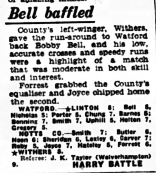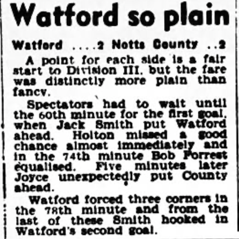 20th August 1960-Division Three, Watford 2 Notts County 2 Leave a Reply http://watford.fcdb.info?id=2321 Sunday Dispatch, 21 Aug 1960 Sunday People, 21 Aug 1960 Watford Observer match report Taken from the programme on 30th August 1960-Division Three, Watford 6 Brentford 1 https://www.soccerbase.com/matches/results.sd?date=1960-08-20 https://www.11v11.com/league-tables/league-division-three/20-august-1960/ Share this: Share on X (Opens in new window) X Share on Facebook (Opens in new window) Facebook