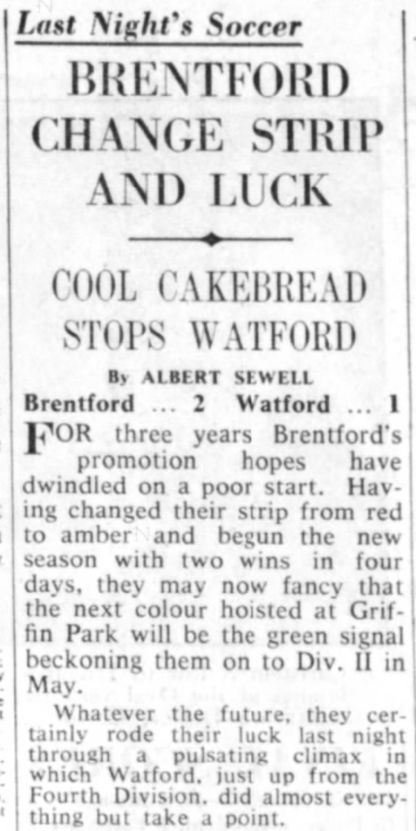 30th August 1960-Division Three, Watford 6 Brentford 1 Leave a Reply http://watford.fcdb.info?id=2324 Daily Telegraph, 31 Aug 1960 Watford Observer match report Share this: Share on X (Opens in new window) X Share on Facebook (Opens in new window) Facebook
