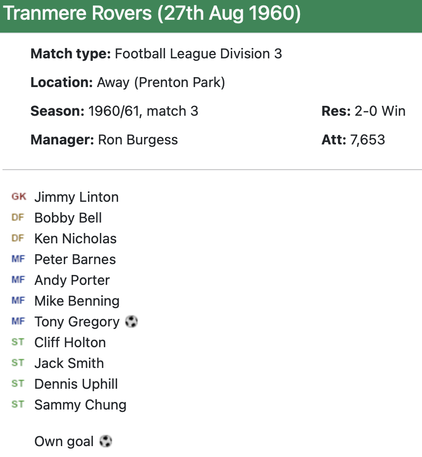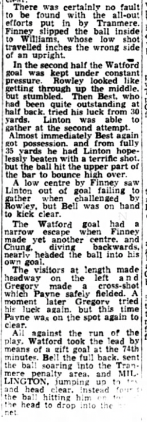 27th August 1960- Division Three, Tranmere Rovers 0 Watford 2 http://watford.fcdb.info/index.php?page=matches Watford Observer match report Liverpool Echo, 27 Aug 1960 Sunday Dispatch, 28 Aug 1960 https://www.soccerbase.com/matches/results.sd?date=1960-08-27 https://www.11v11.com/league-tables/league-division-three/27-august-1960/ Share this: Share on X (Opens in new window) X Share on Facebook (Opens in new window) Facebook