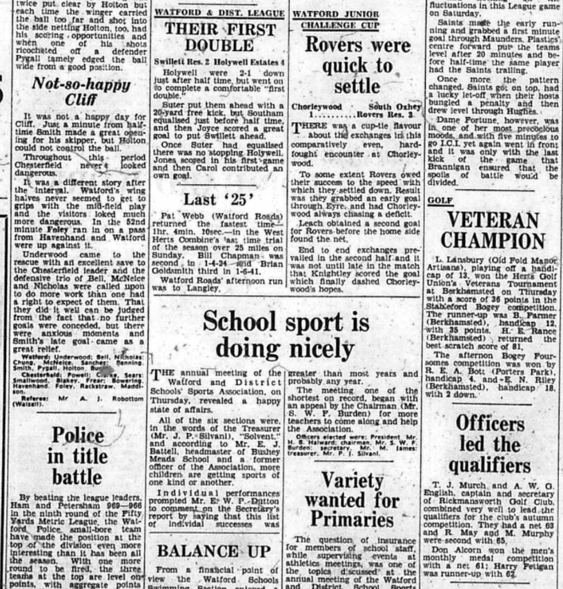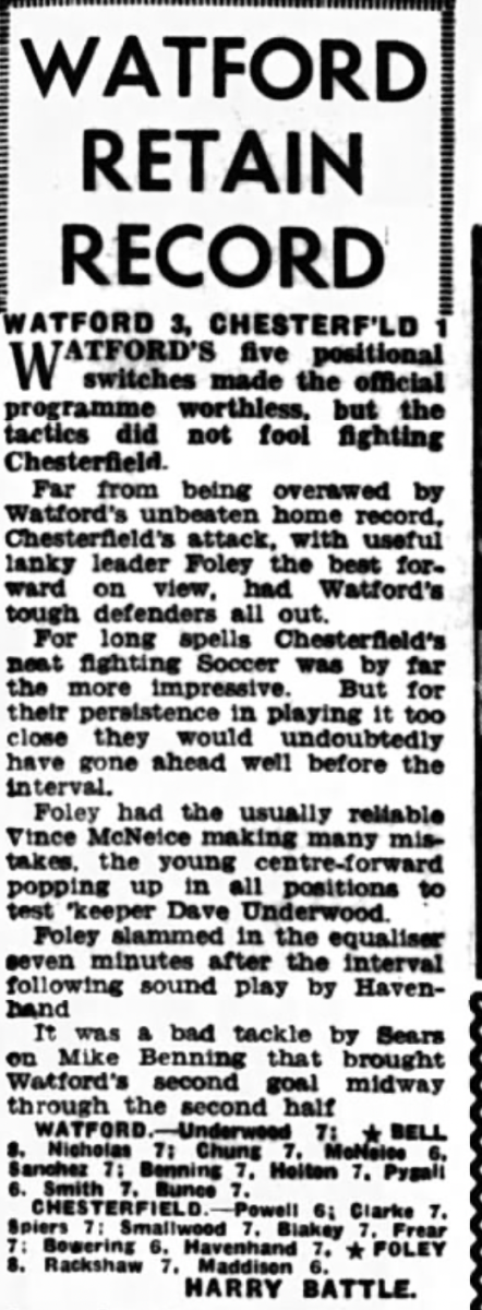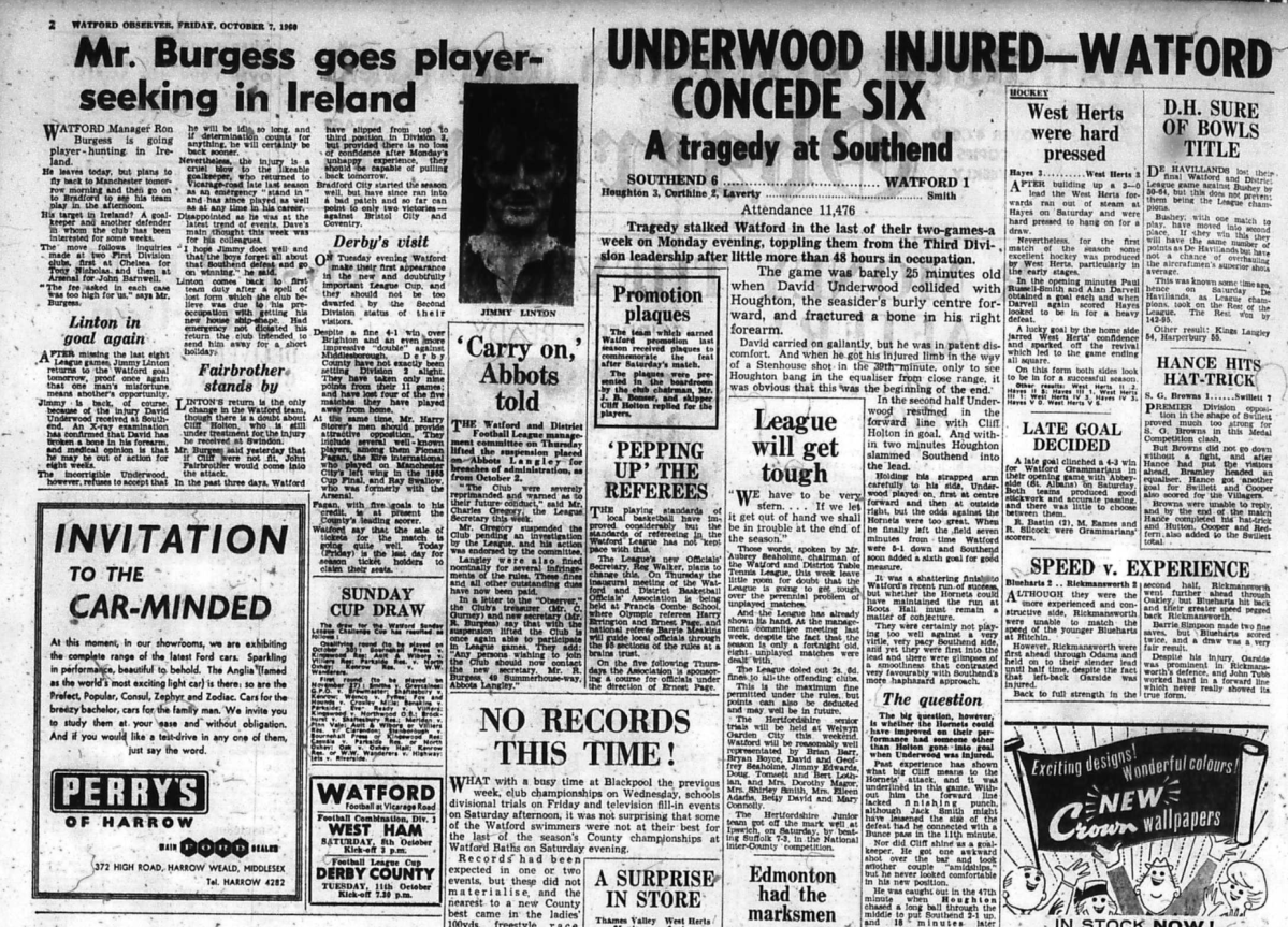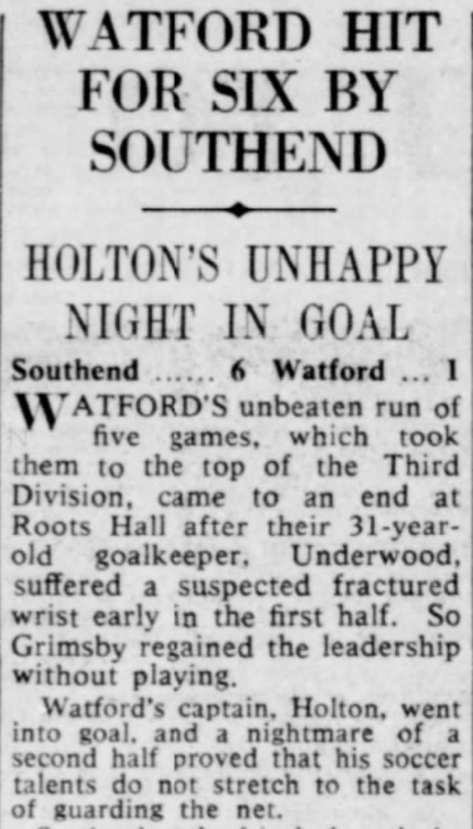 Going into this match we were top of the table and unbeaten in seven games. After Southend opened the scoring, this being in the days before substitutes, our goalkeeper Dave Underwood broke his arm and so Cliff Holton took over in goal and conceded the other five. It would be another three months before we won again.