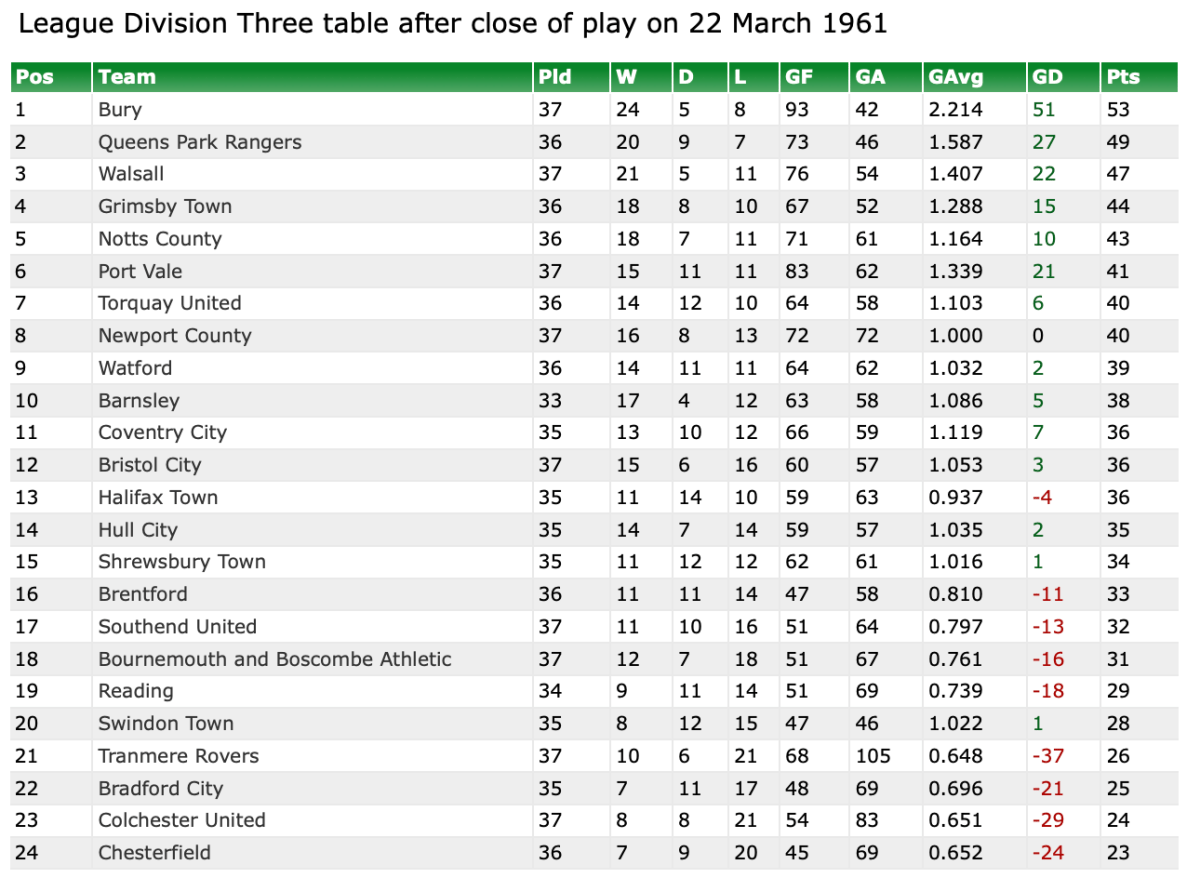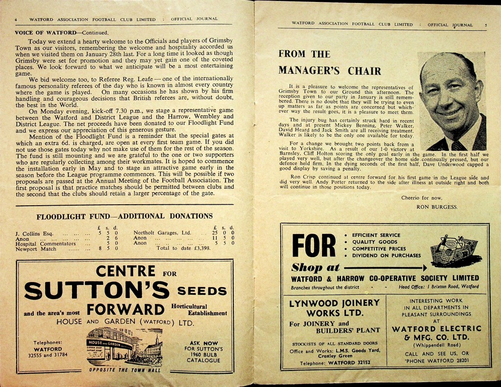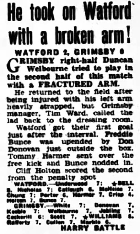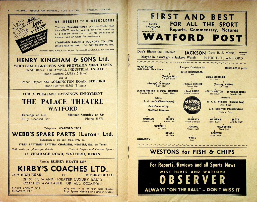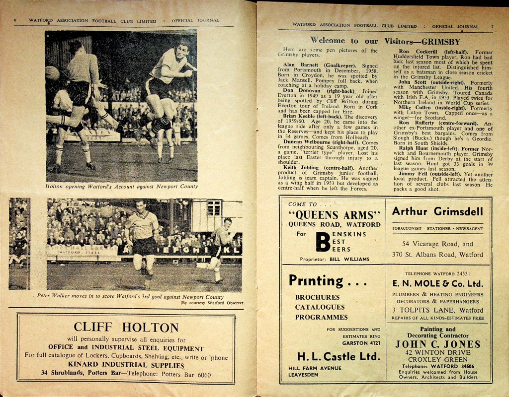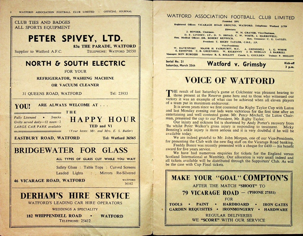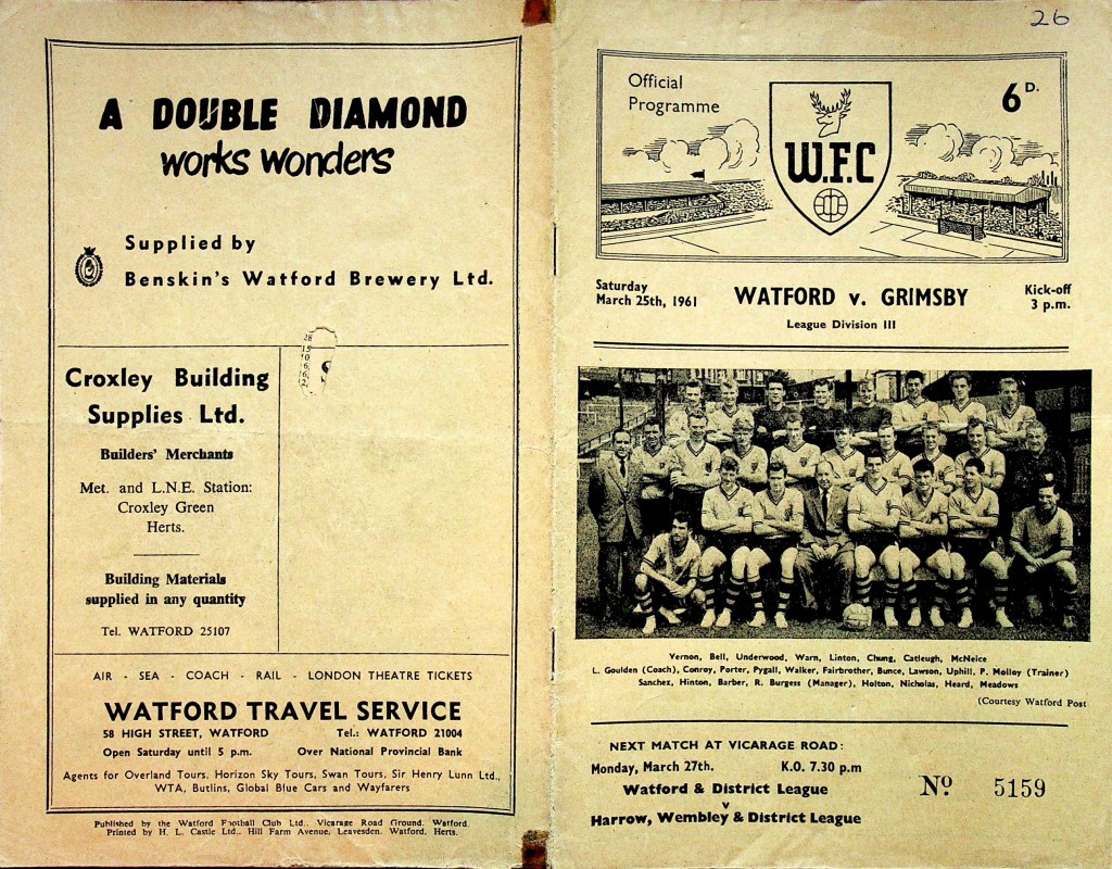 25th March 1961- Division Three, Watford 2 Grimsby Town 0 Leave a Reply http://watford.fcdb.info?id=2363 Watford Observer match report Sunday Dispatch, 26 Mar 1961 Sunday People, 26 Mar 1961 https://www.soccerbase.com/matches/results.sd?date=1961-03-25 https://www.11v11.com/league-tables/league-division-three/25-march-1961/ Share this: Click to share on X (Opens in new window) X Click to share on Facebook (Opens in new window) Facebook