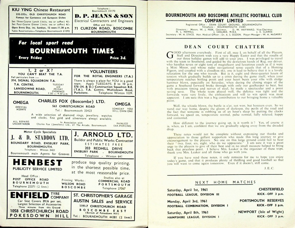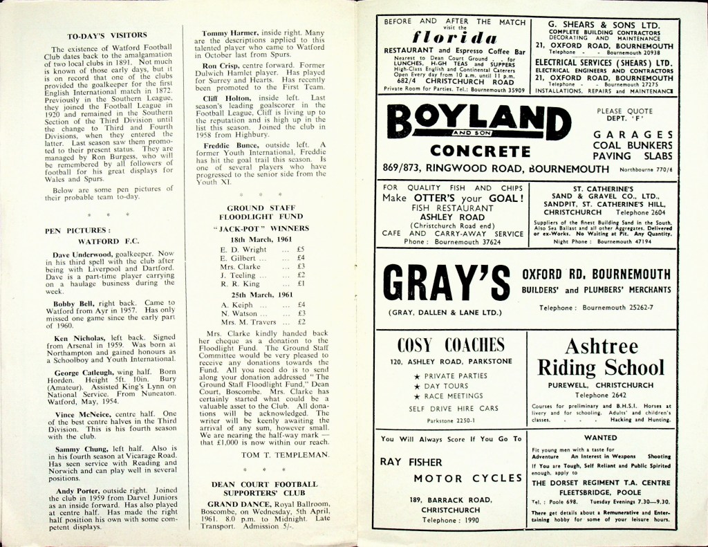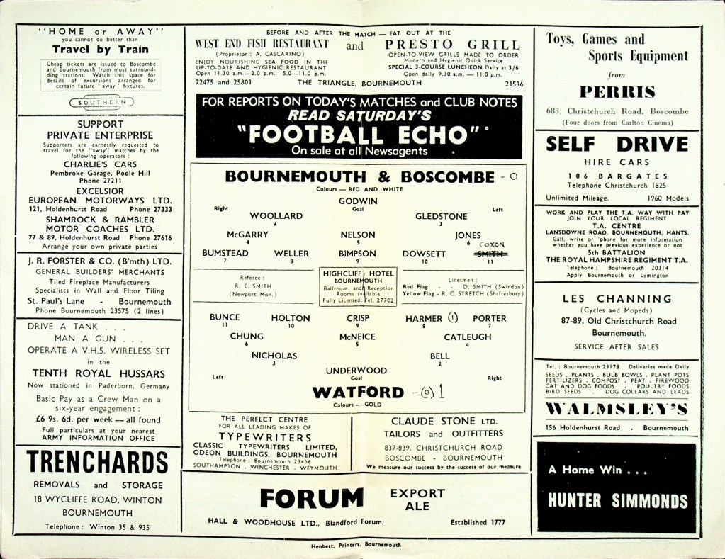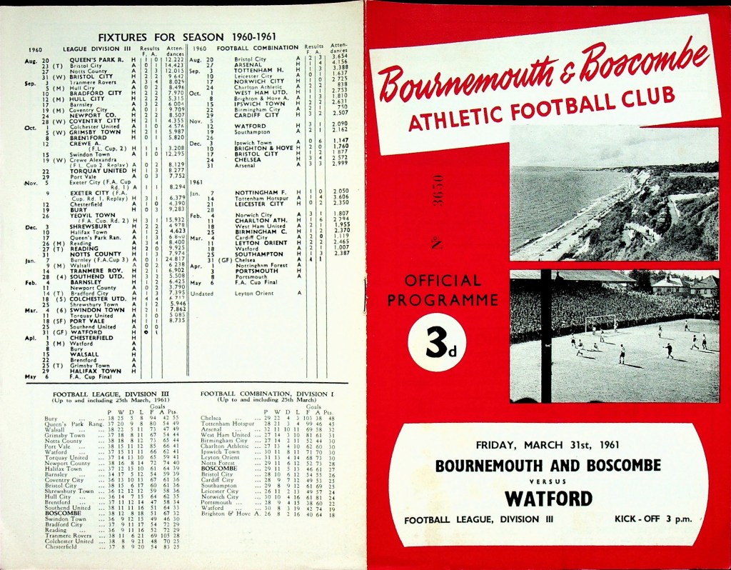 31st March 1961- Division Three, Bournemouth & Boscombe Athletic 0 Watford 1 Leave a Reply http://watford.fcdb.info?id=2364 Watford Observer match report https://www.soccerbase.com/matches/results.sd?date=1961-03-31 https://www.11v11.com/league-tables/league-division-three/31-march-1961/ Share this: Click to share on X (Opens in new window) X Click to share on Facebook (Opens in new window) Facebook