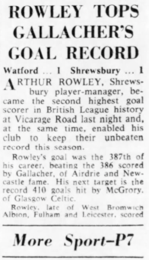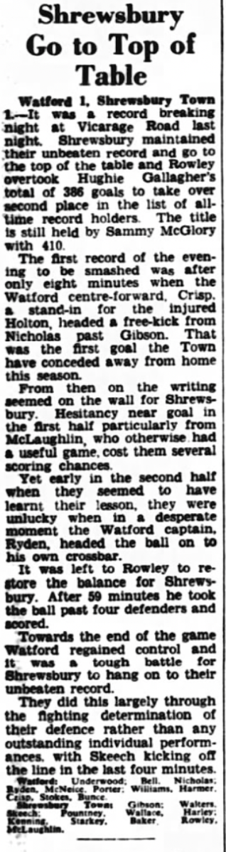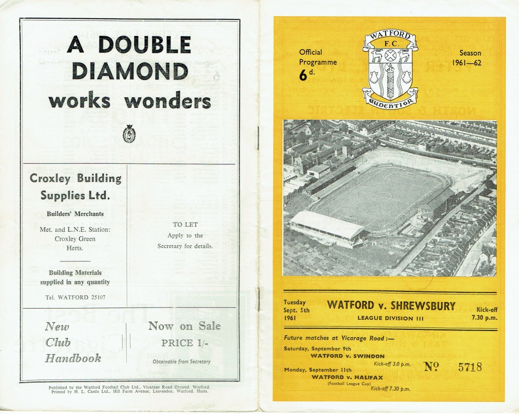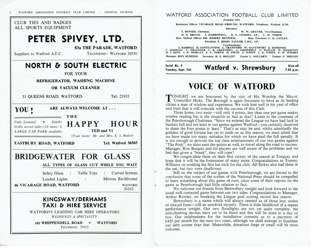 5th September 1961- Division Three, Watford 1 Shrewsbury Town 1 Leave a Reply http://watford.fcdb.info?id=2378 Daily Telegraph, 6 Sep 1961 Birmingham Mail, 6 Sep 1961 Watford Observer match report Share this: Share on X (Opens in new window) X Share on Facebook (Opens in new window) Facebook