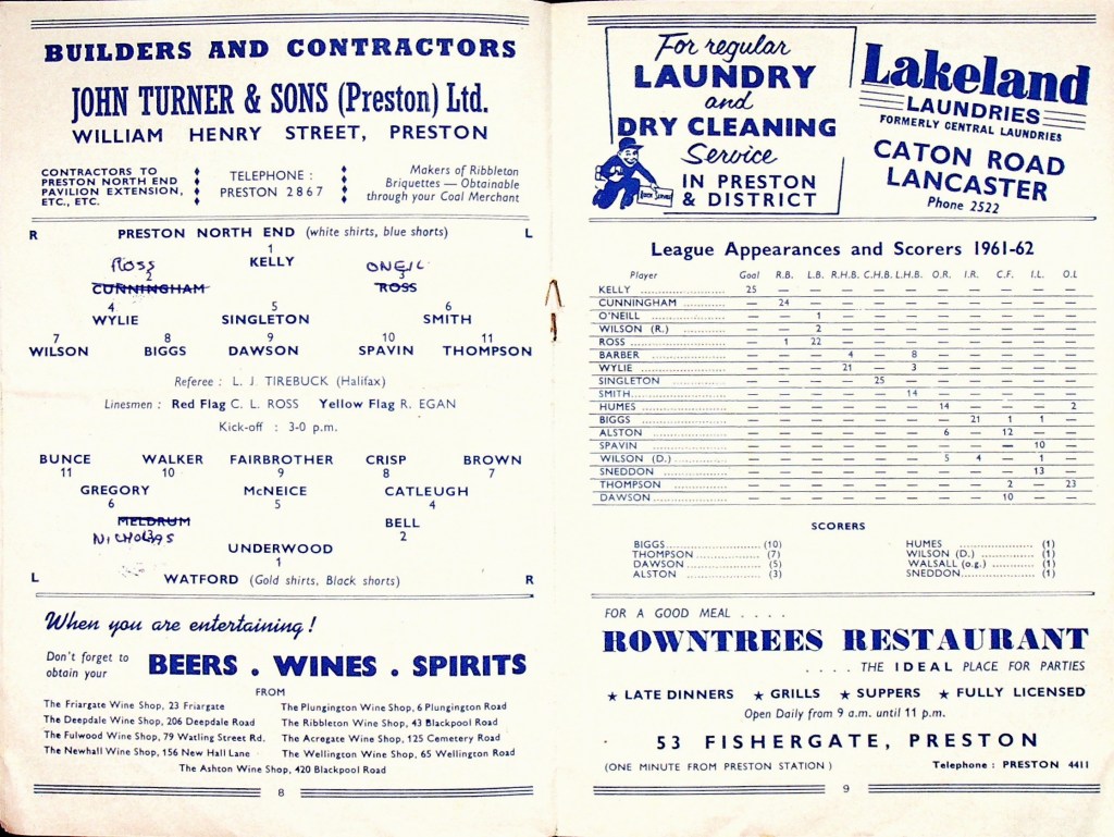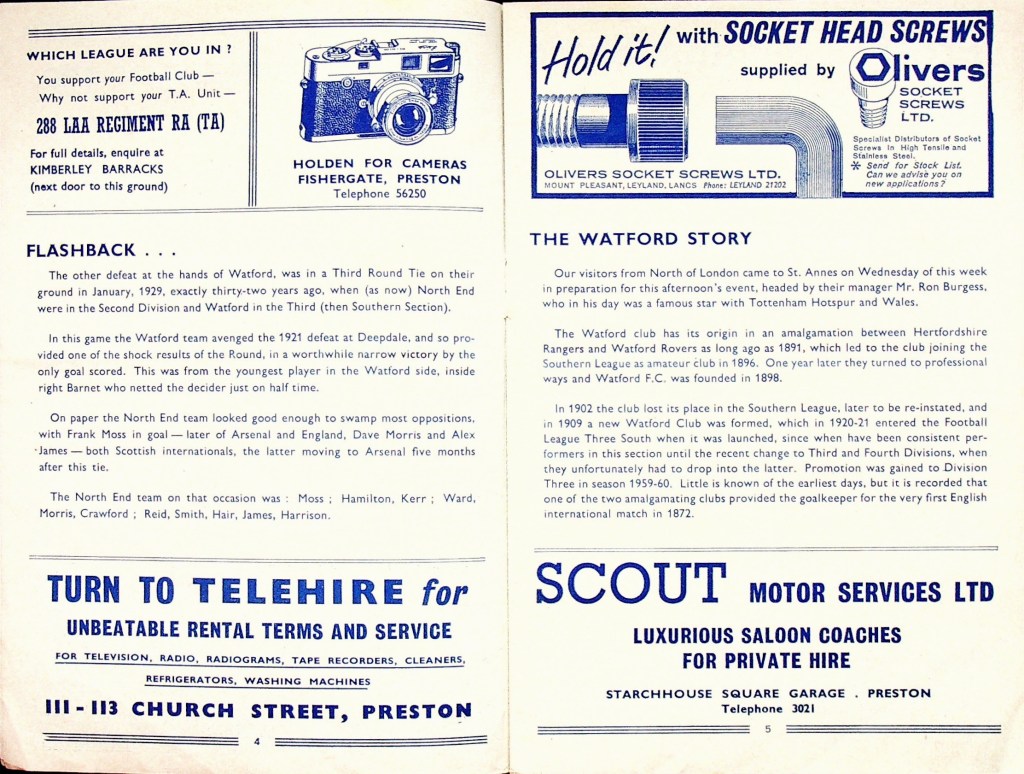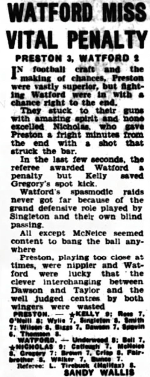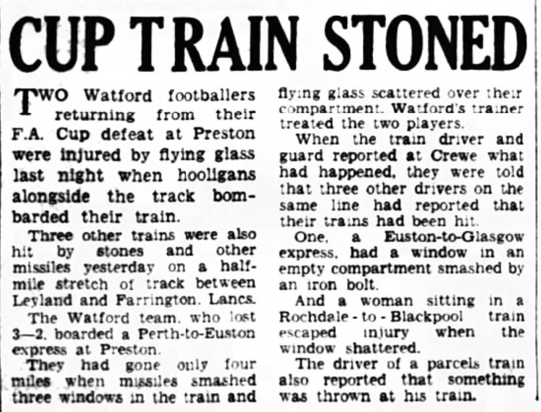 6th January 1962- FA Cup Third Round, Preston North End 3 Watford 2 2 Replies After the match two of our players were injured when stones were thrown at the train the team were travelling back on. http://watford.fcdb.info/index.php?page=matches Evening Standard, 6 Jan 1962 Sunday People, 7 Jan 1962 Sunday People, 7 Jan 1962 Watford Observer match report https://en.wikipedia.org/wiki/1961%E2%80%9362_FA_Cup Share this: Share on X (Opens in new window) X Share on Facebook (Opens in new window) Facebook