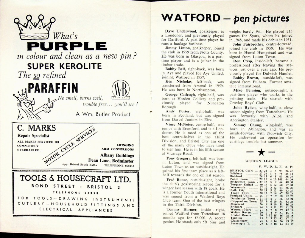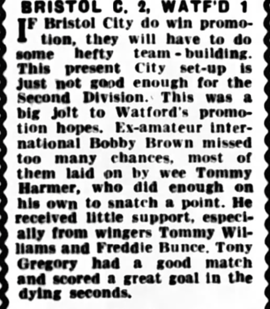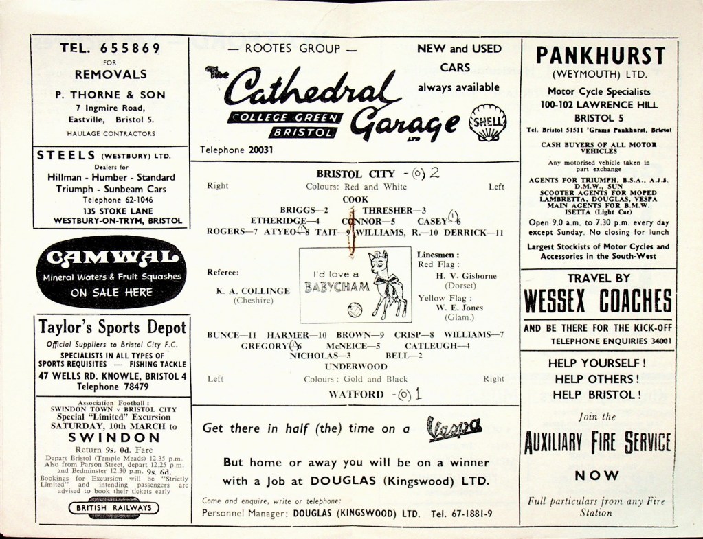 3rd March 1962- Division Three, Bristol City 2 Watford 1 Leave a Reply http://watford.fcdb.info/index.php?page=matches Sunday People, 4 Mar 1962 Watford Observer match report https://www.soccerbase.com/matches/results.sd?date=1962-03-03 https://www.11v11.com/league-tables/league-division-three/03-march-1962/ Share this: Share on X (Opens in new window) X Share on Facebook (Opens in new window) Facebook