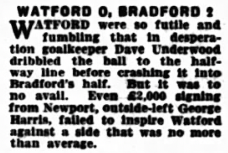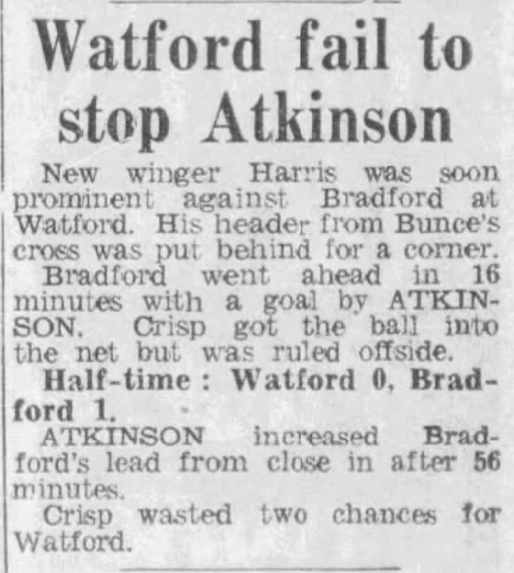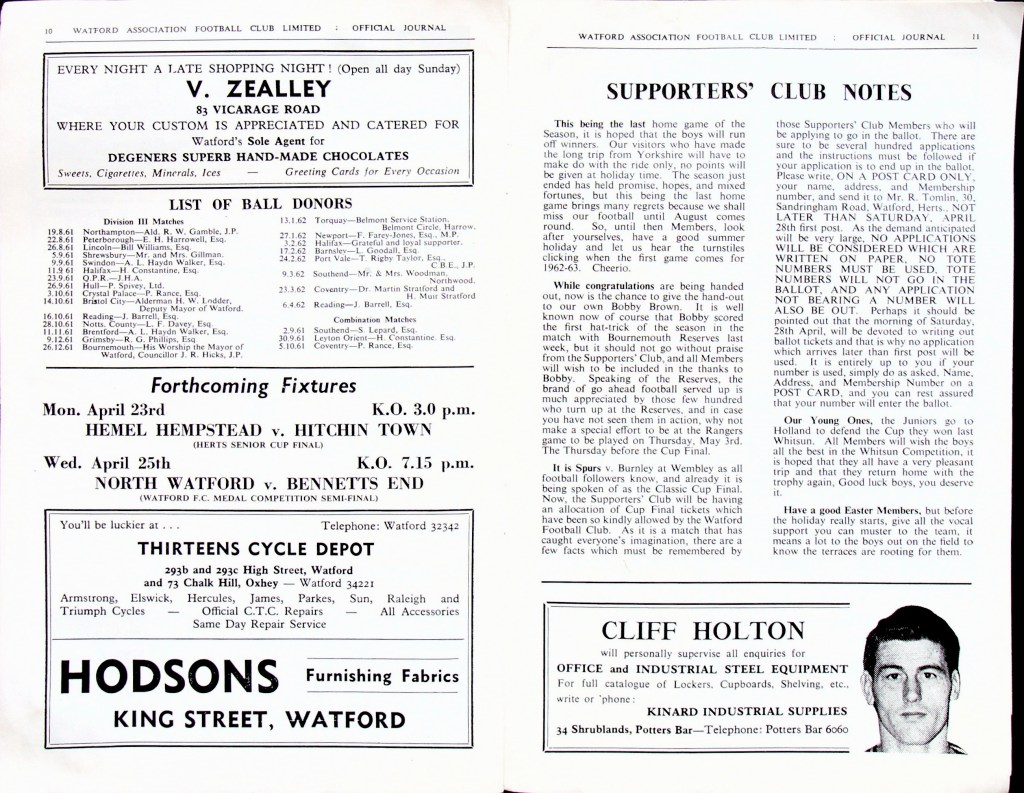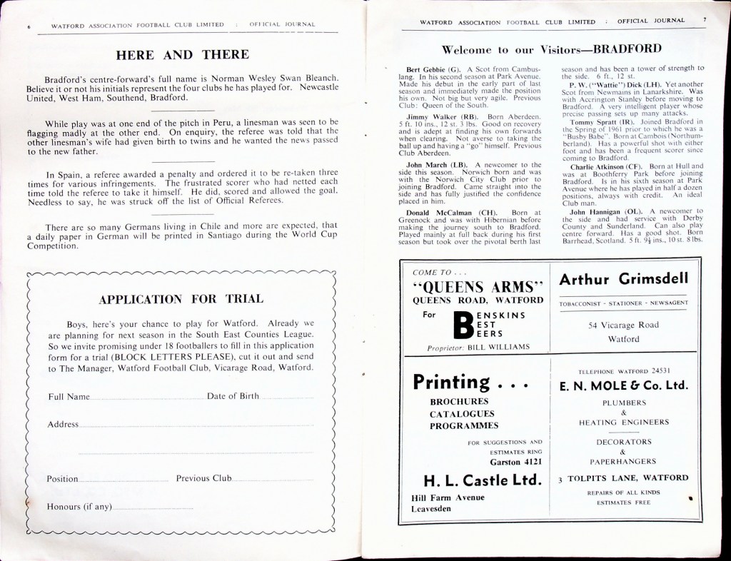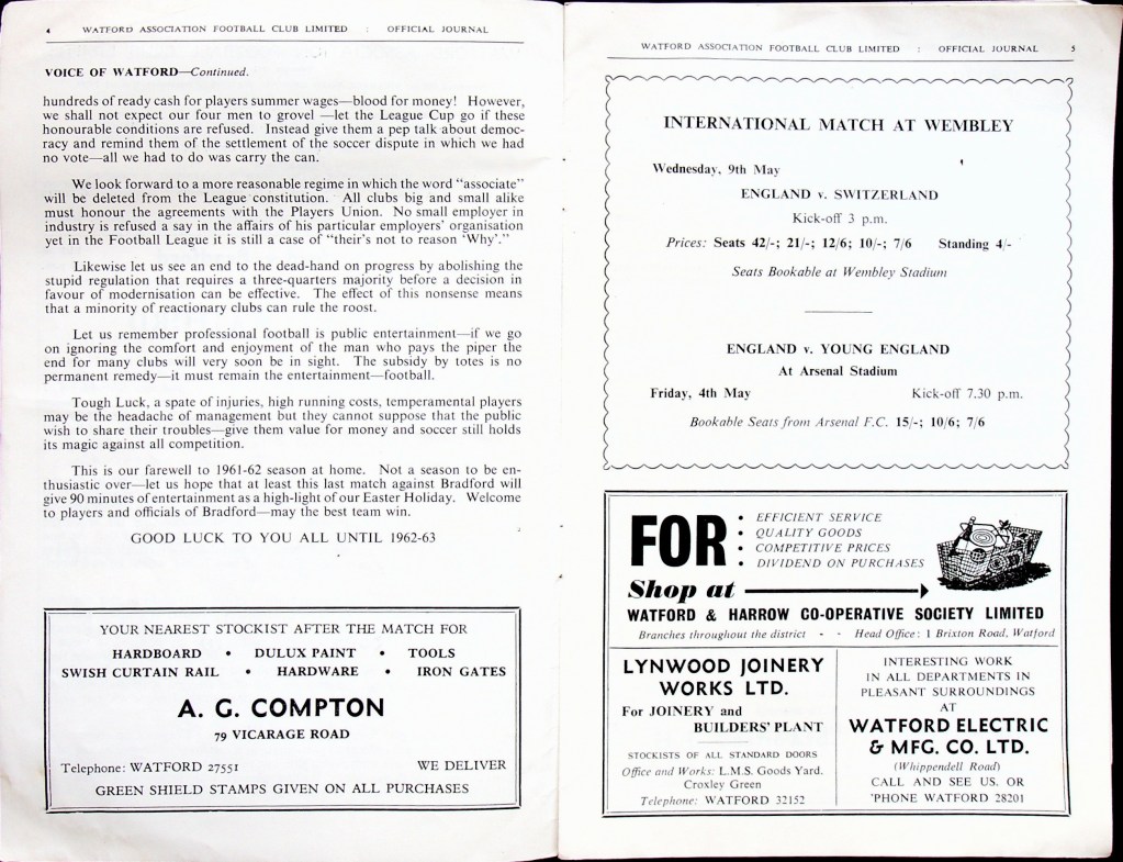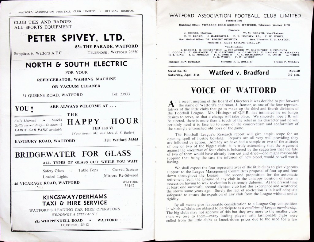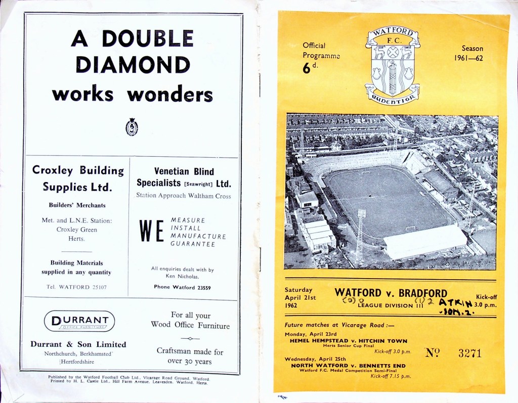 21st April 1962- Division Three, Watford 0 Bradford (Park Avenue) 2