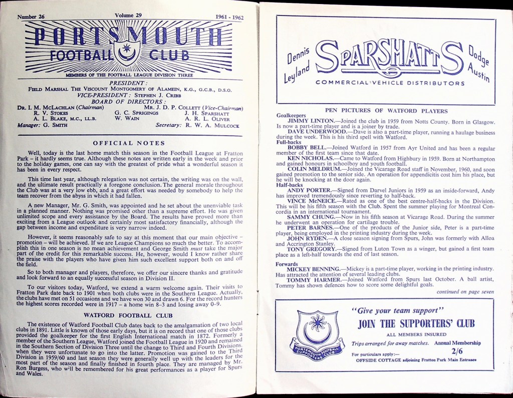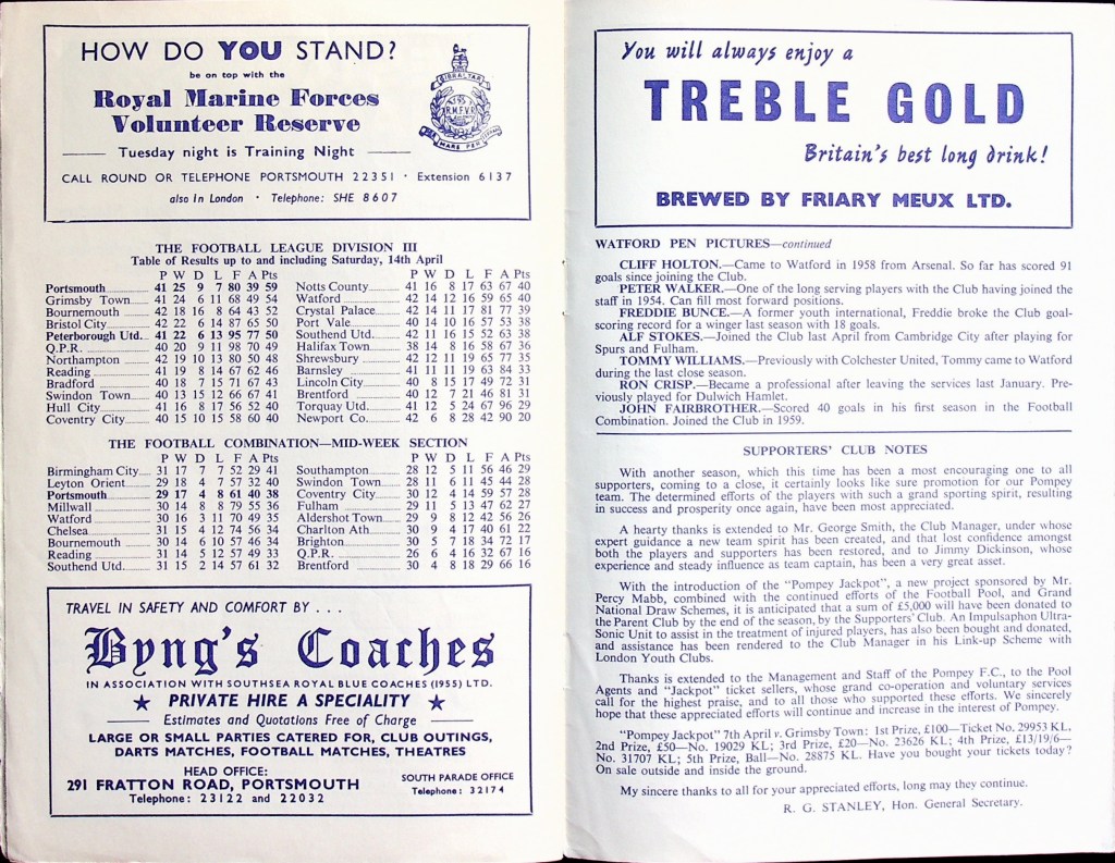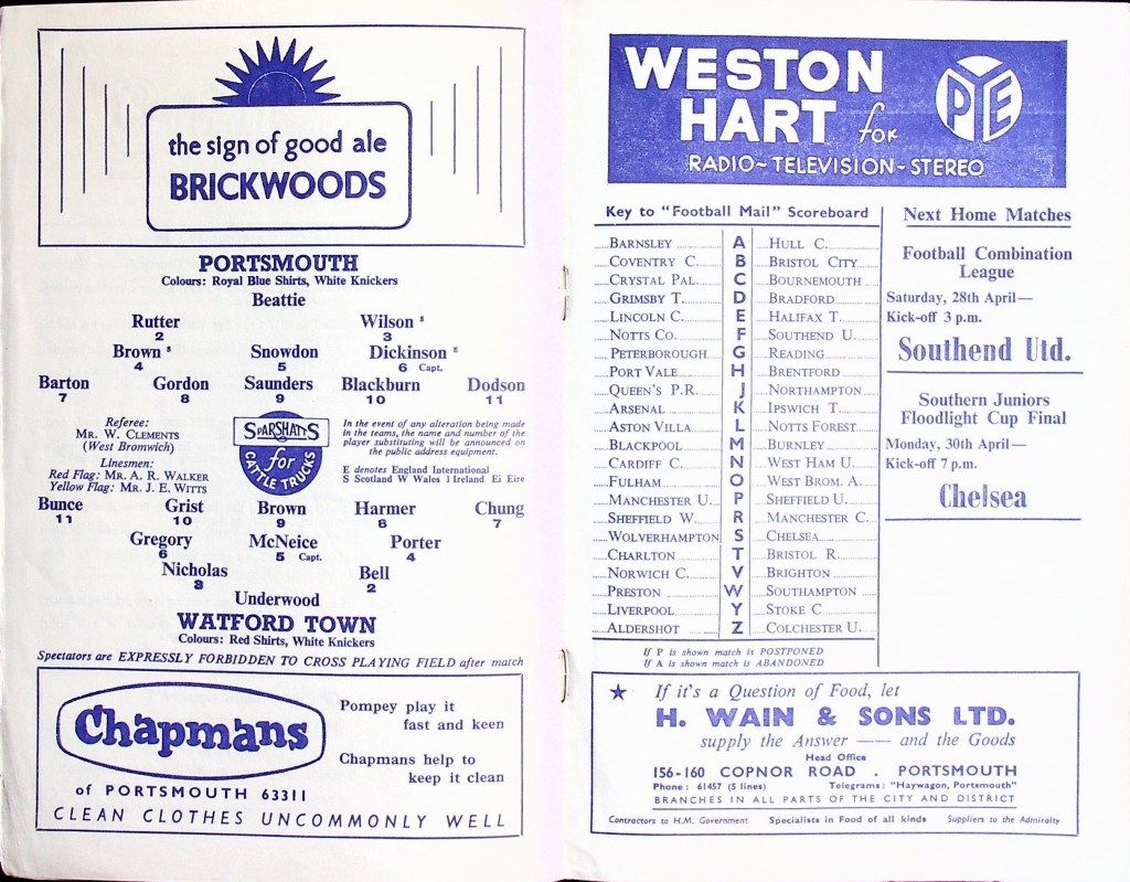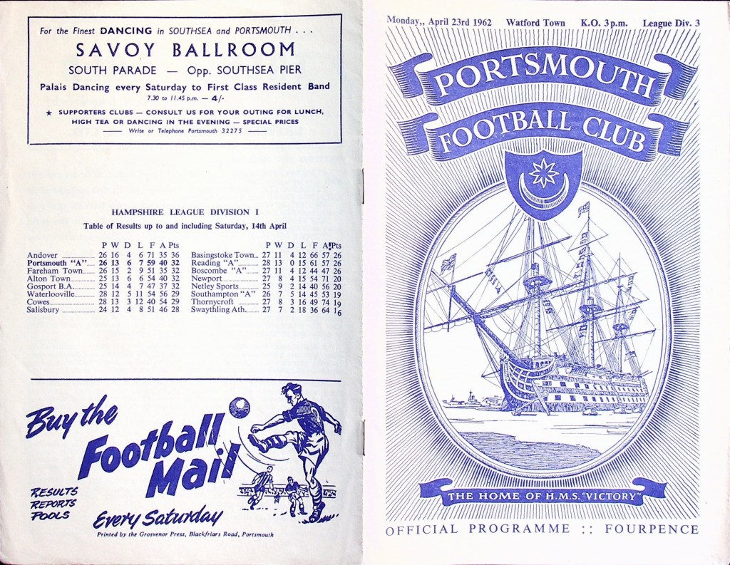 23rd April 1962- Division Three, Portsmouth 2 Watford 1