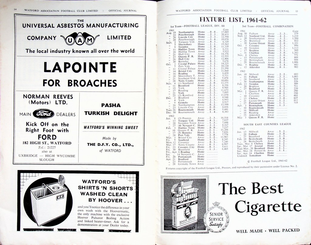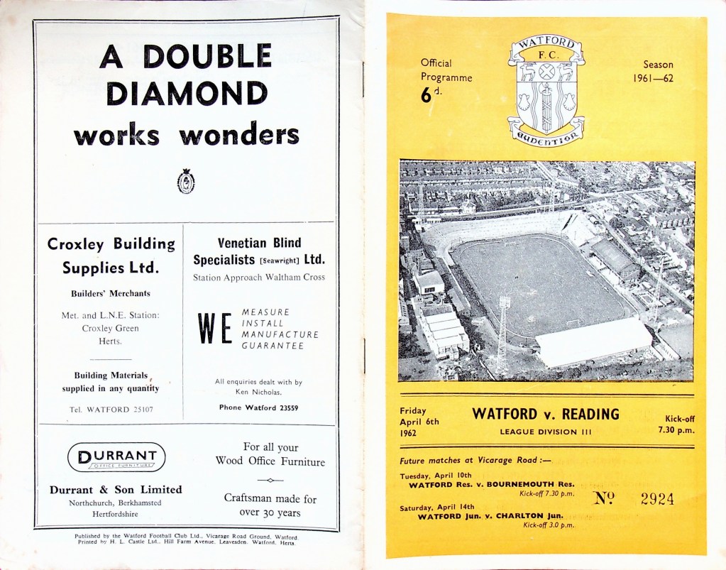 6th April 1962- Division Three, Watford 1 Reading 1 Leave a Reply http://watford.fcdb.info?id=2421 Daily Herald, 7 Apr 1962 Watford Observer match report https://www.soccerbase.com/matches/results.sd?date=1962-04-06 https://www.11v11.com/league-tables/league-division-three/06-april-1962/ Share this: Share on X (Opens in new window) X Share on Facebook (Opens in new window) Facebook