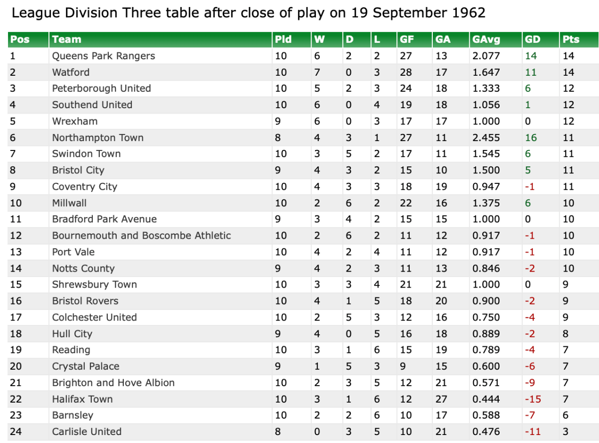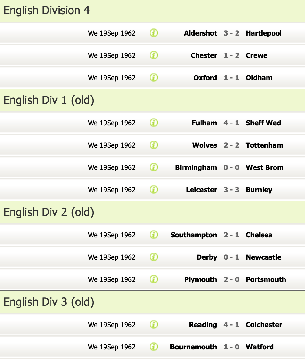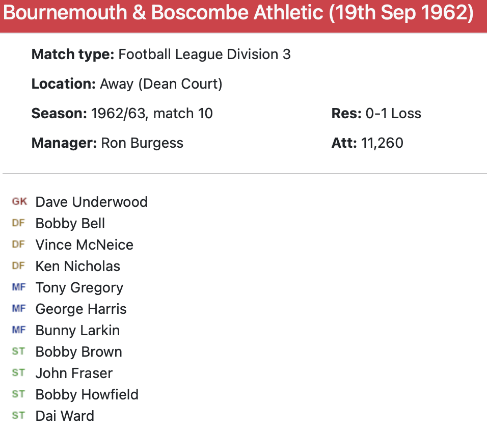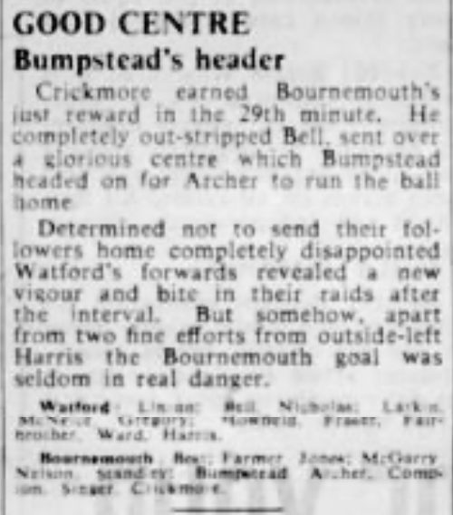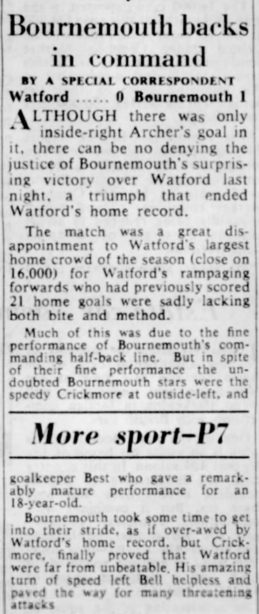 19th September 1962- Division Three, Bournemouth & Boscombe Athletic 1 Watford 0 http://watford.fcdb.info/index.php?page=matches Daily Mirror, 20 Sep 1962 Watford Observer match report https://www.soccerbase.com/matches/results.sd?date=1962-09-19 https://www.11v11.com/league-tables/league-division-three/19-september-1962/ Share this: Share on X (Opens in new window) X Share on Facebook (Opens in new window) Facebook