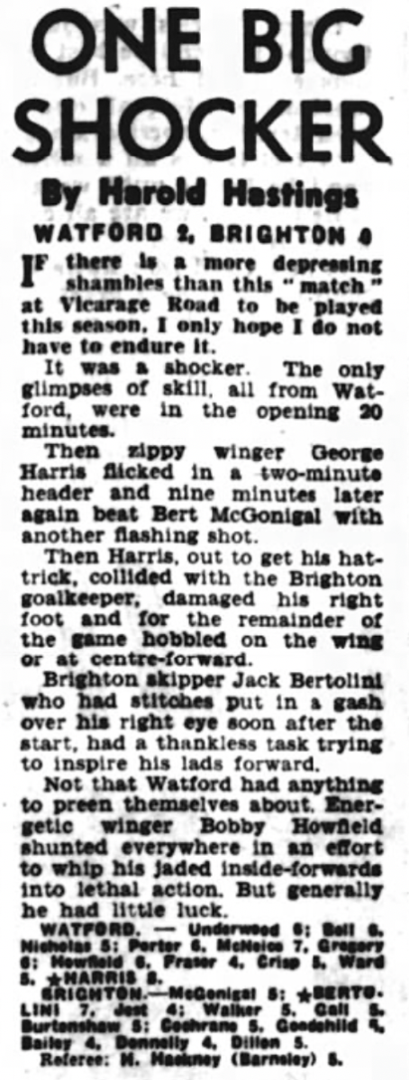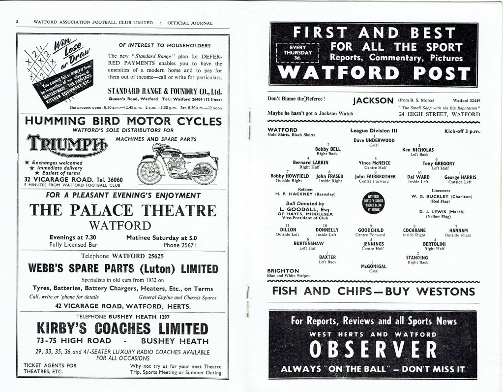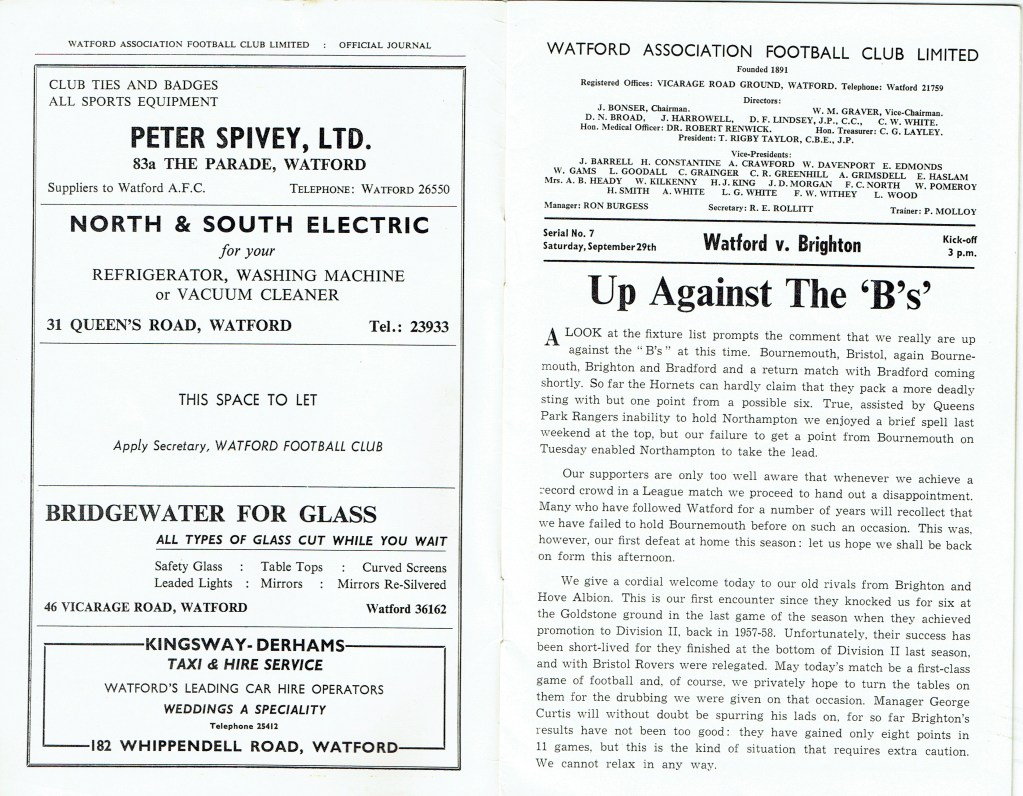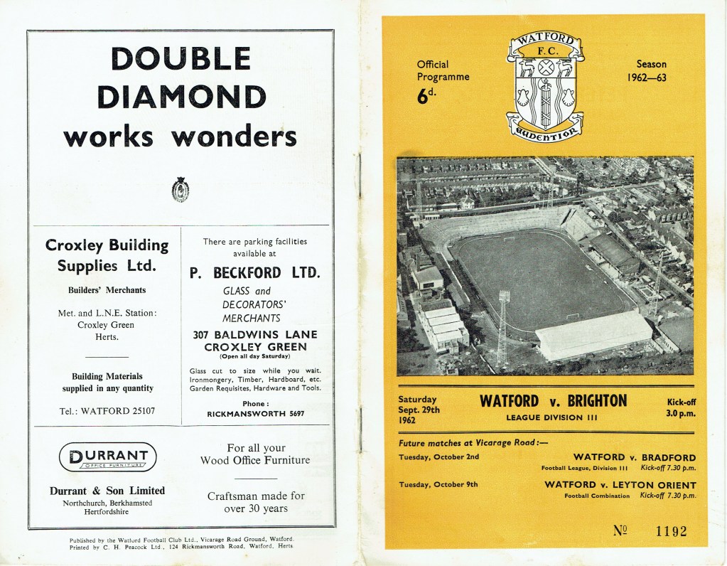 29th September 1962- Division Three, Watford 2 Brighton & Hove Albion 0 Leave a Reply http://watford.fcdb.info?id=2440 Sunday People, 30 Sep 1962 Watford Observer match report Share this: Share on X (Opens in new window) X Share on Facebook (Opens in new window) Facebook