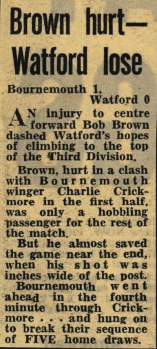 25th September 1962- Division Three, Watford 0 Bournemouth & Boscombe Athletic 1 Leave a Reply http://watford.fcdb.info?id=2439 Daily Mirror, 26 Sep 1962 Daily Telegraph, 26 Sep 1962 Watford Observer match report https://www.soccerbase.com/matches/results.sd?date=1962-09-25 Share this: Share on X (Opens in new window) X Share on Facebook (Opens in new window) Facebook