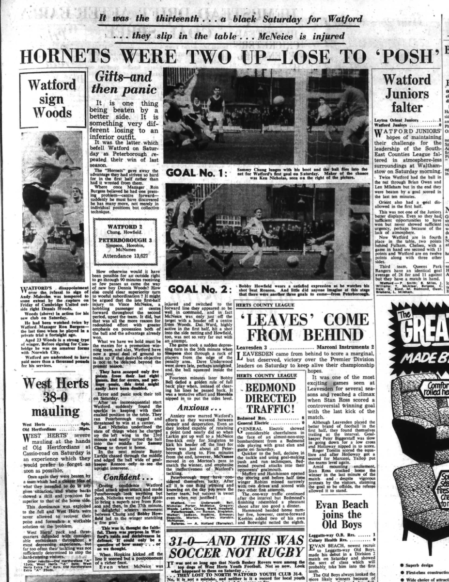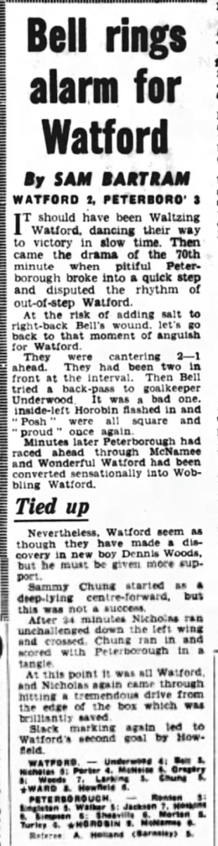 13th October 1962-Division Three, Watford 2 Peterborough United 3 Leave a Reply http://watford.fcdb.info?s=31458&id=2444 Sunday People, 14 Oct 1962 Watford Observer match report Share this: Click to share on X (Opens in new window) X Click to share on Facebook (Opens in new window) Facebook