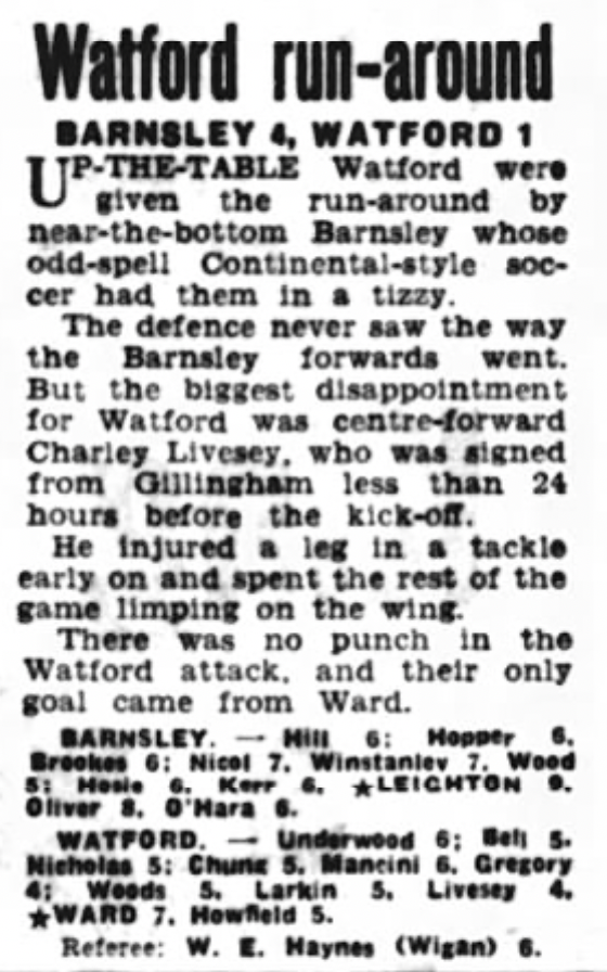 20th October 1962- Division Three, Barnsley 4 Watford 1 Leave a Reply http://watford.fcdb.info?id=2445 Sunday People, 21 Oct 1962 Watford Observer match report https://www.soccerbase.com/matches/results.sd?date=1962-10-20 https://www.11v11.com/league-tables/league-division-three/20-october-1962/ Share this: Click to share on X (Opens in new window) X Click to share on Facebook (Opens in new window) Facebook