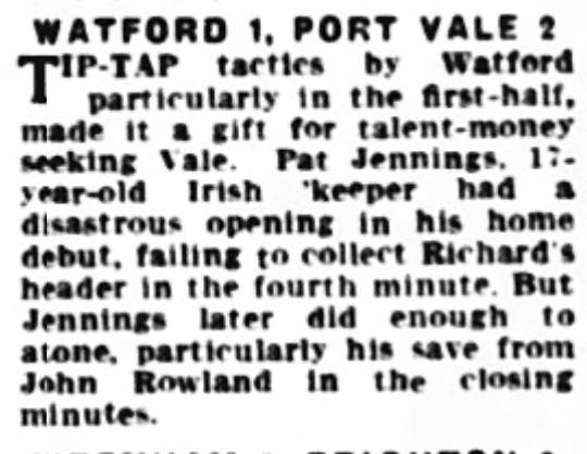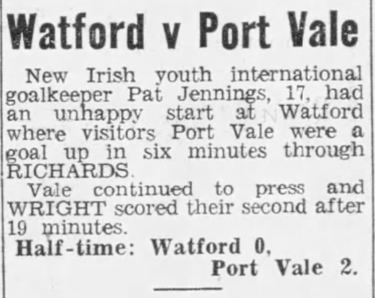 18th May 1963- Division Three, Watford 1 Port Vale 2 Leave a Reply Evening Standard, 18 May 1963 Sunday People, 19 May 1963 Watford Observer match report http://watford.fcdb.info?id=2478 The final table looked like this. Share this: Share on X (Opens in new window) X Share on Facebook (Opens in new window) Facebook