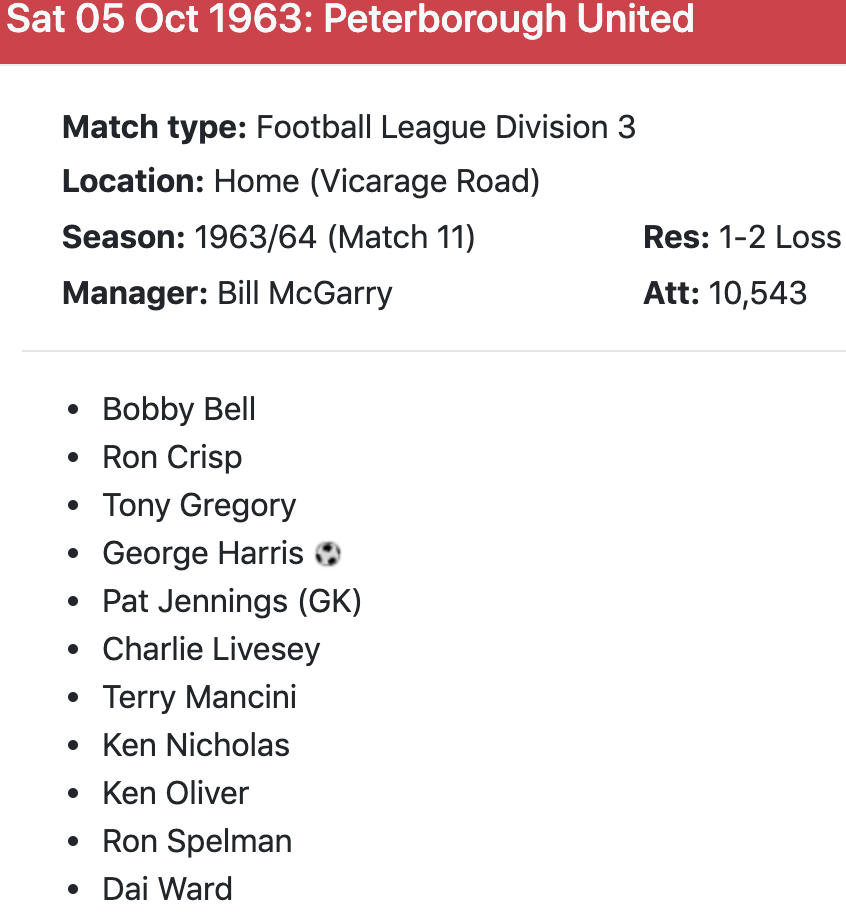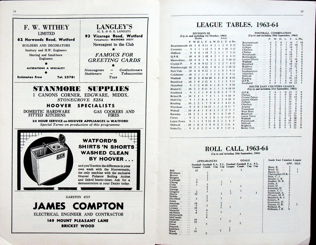 5th October 1963- Division Three, Watford 1 Peterborough United 2 Leave a Reply http://watford.fcdb.info?id=2490 Sunday People, 6 Oct 1963 Watford Observer match report https://www.soccerbase.com/matches/results.sd?date=1963-10-05 https://www.11v11.com/league-tables/league-division-three/05-october-1963/ Share this: Share on X (Opens in new window) X Share on Facebook (Opens in new window) Facebook