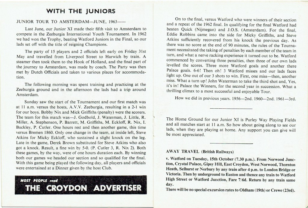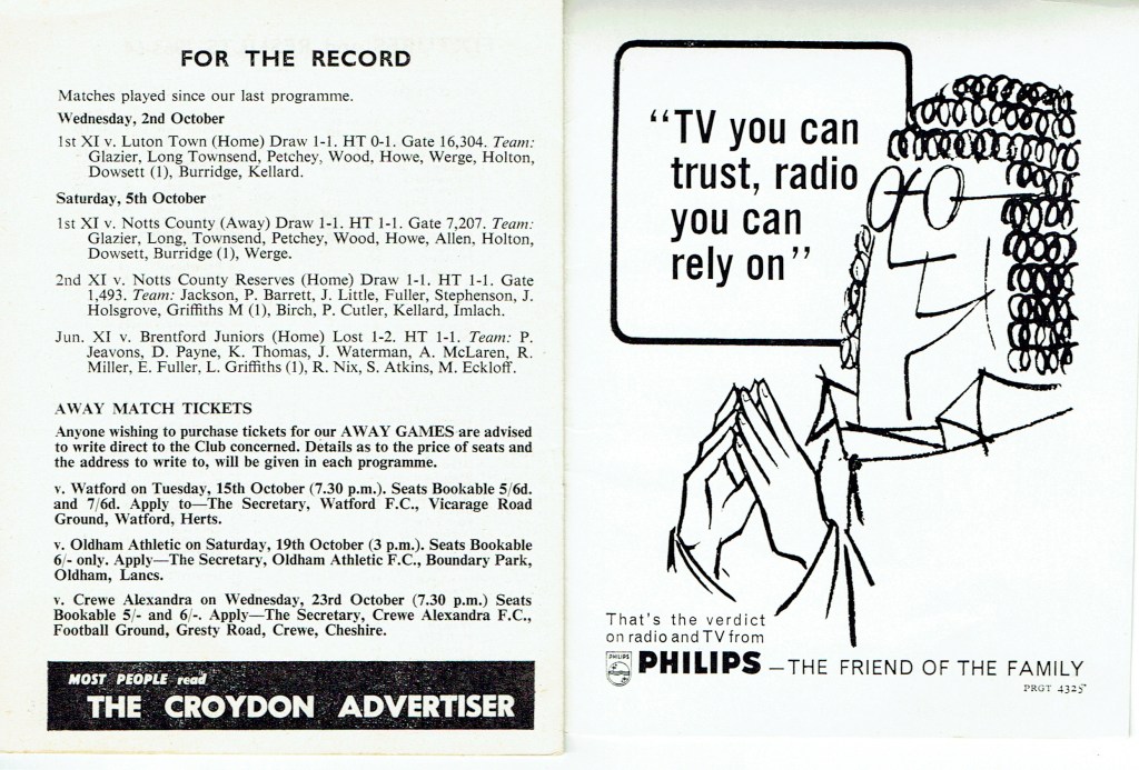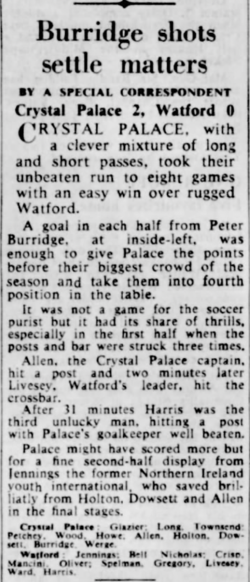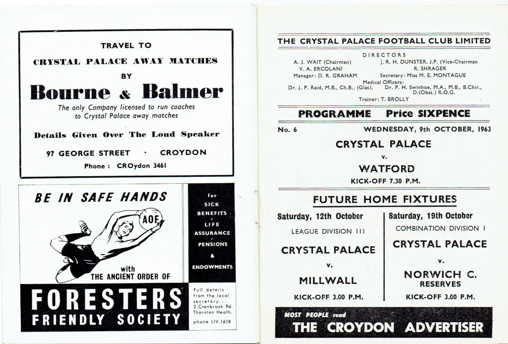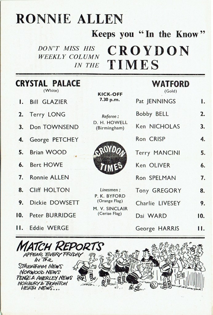 9th October 1963- Division Three, Crystal Palace 2 Watford 0 Leave a Reply http://watford.fcdb.info?id=2491 Daily Telegraph, 10 Oct 1963 Watford Observer match report https://www.soccerbase.com/matches/results.sd?date=1963-10-09 https://www.11v11.com/league-tables/league-division-three/09-october-1963/ Share this: Share on X (Opens in new window) X Share on Facebook (Opens in new window) Facebook