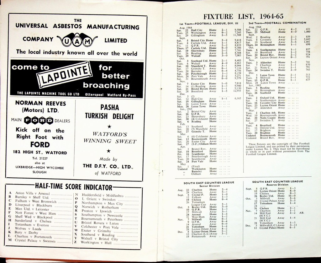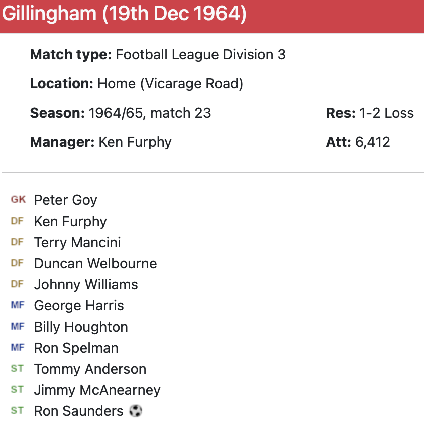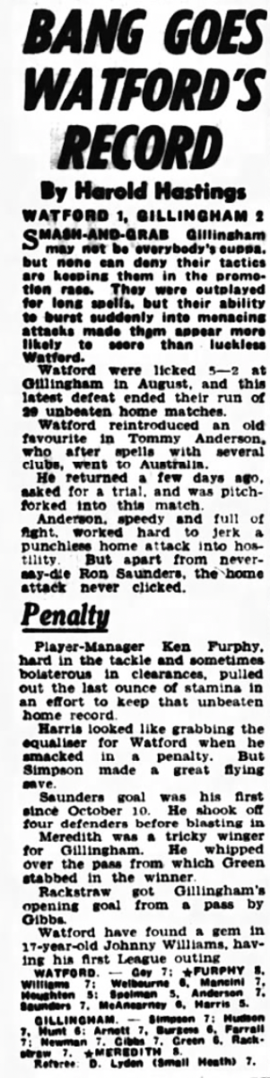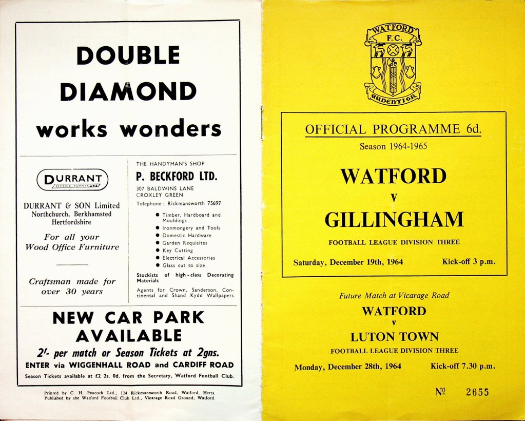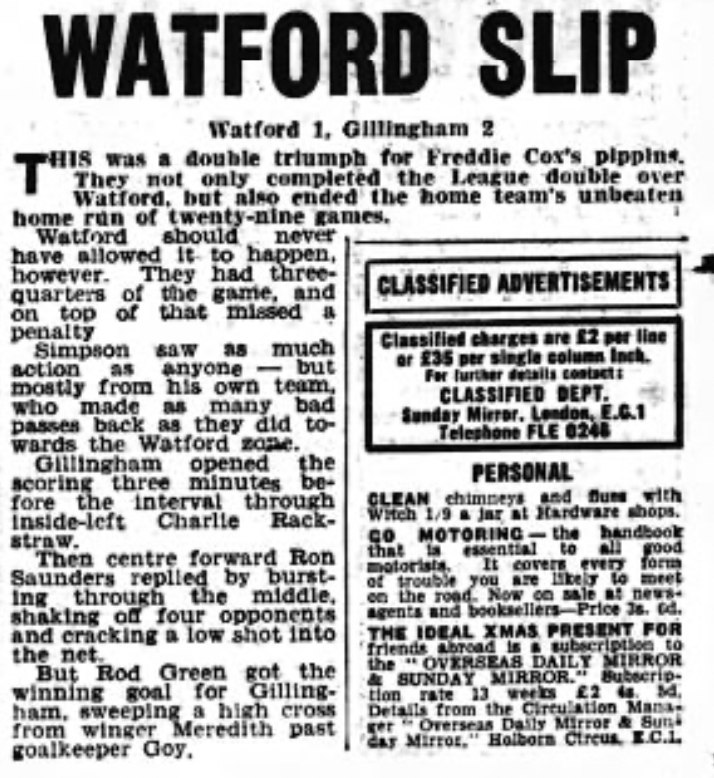 19th December 1964- Division Three, Watford 1 Gillingham 2 Leave a Reply http://watford.fcdb.info/index.php?page=matches Sunday Mirror, 20 Dec 1964 Sunday People, 20 Dec 1964 Watford Observer match report https://www.soccerbase.com/matches/results.sd?date=1964-12-19 https://www.11v11.com/league-tables/league-division-three/19-december-1964/ Share this: Share on X (Opens in new window) X Share on Facebook (Opens in new window) Facebook