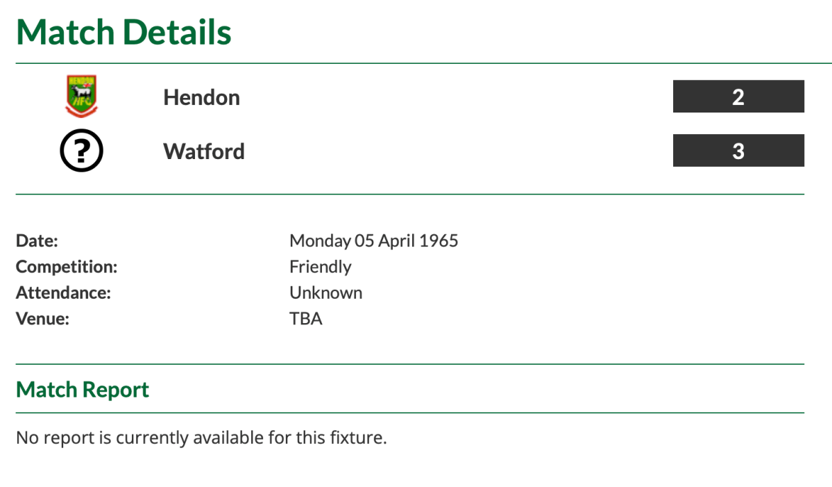 5th April 1965- Friendly, Hendon 2 Watford 3 https://www.watfordfcarchive.co.uk/fixture/1965-04-05 https://www.hendonfc.net/Reports/3814 Watford Observer match report Share this: Share on X (Opens in new window) X Share on Facebook (Opens in new window) Facebook
