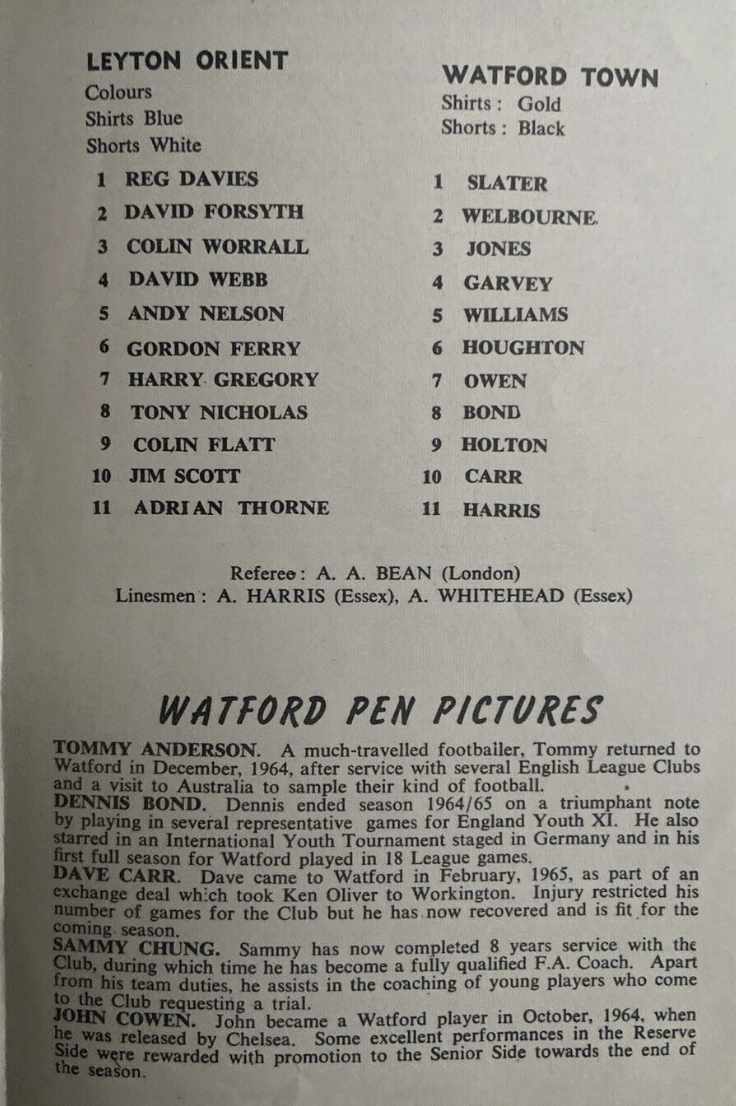 14th August 1965- Friendly, Leyton Orient 0 Watford 5 https://www.watfordfcarchive.co.uk/fixture/1965-08-14 Evening Standard, 14 Aug 1965 Sunday People, 15 Aug 1968 Watford Observer match report Share this: Share on X (Opens in new window) X Share on Facebook (Opens in new window) Facebook