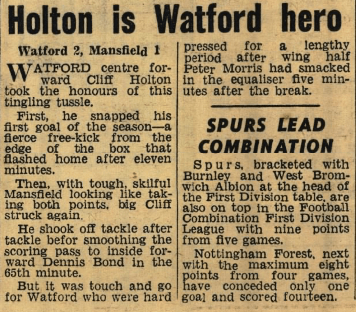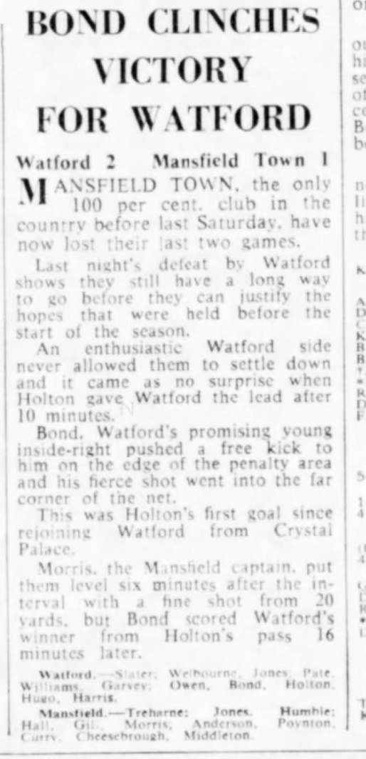 14th September 1965-Division Three, Watford 2 Mansfield Town 1 Leave a Reply http://watford.fcdb.info?id=2583 Daily Mirror, 15 Sep 1965 Daily Telegraph, 15 Sep 1965 Watford Observer match report Share this: Share on X (Opens in new window) X Share on Facebook (Opens in new window) Facebook