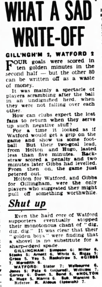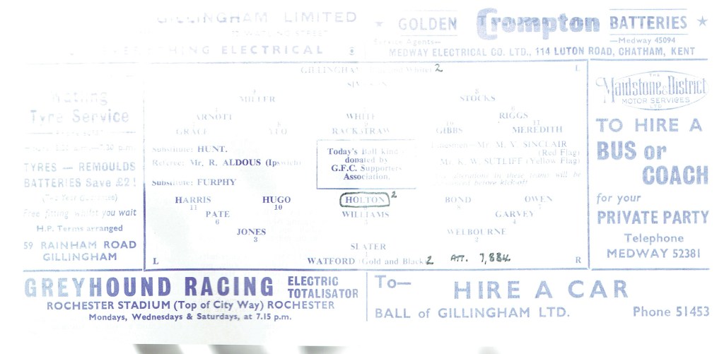 18th September 1965- Division Three, Gillingham 2 Watford 2 Leave a Reply http://watford.fcdb.info?id=2584 Sunday People, 19 Sep 1965 Watford Observer match report Share this: Share on X (Opens in new window) X Share on Facebook (Opens in new window) Facebook