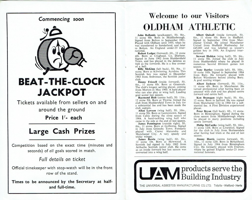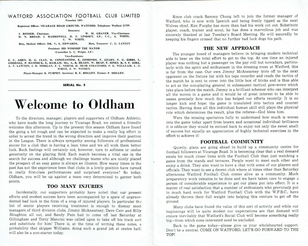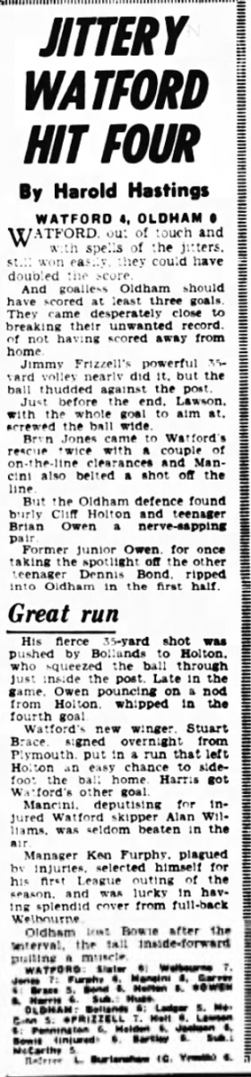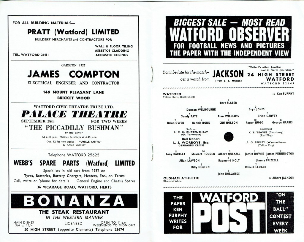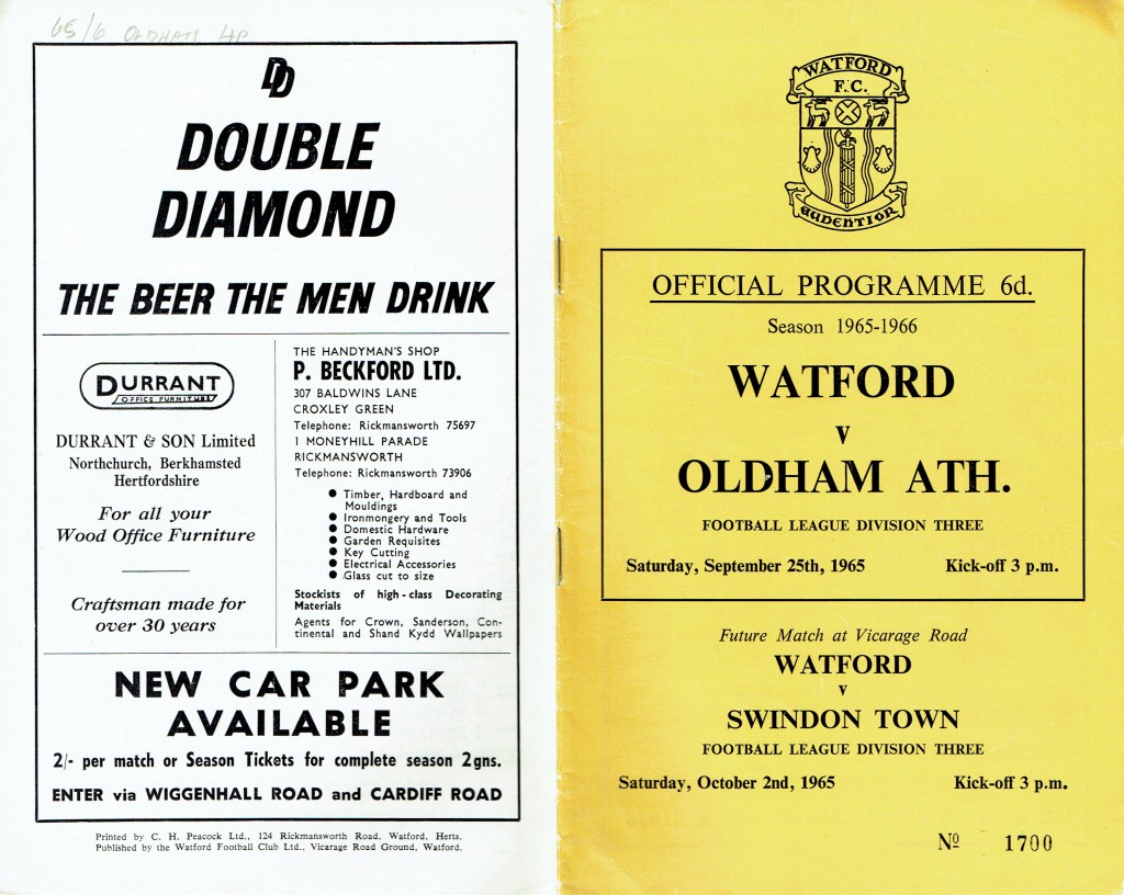25th September 1965- Division Three, Watford 4 Oldham Athletic 0 Leave a Reply http://watford.fcdb.info?id=2586 Sunday People, 26 Sep 1965 Watford Observer match report https://oldwatford.com/2003/03/18/18th-march-2003-new-division-one-watford-0-gillingham-1/ Share this: Share on X (Opens in new window) X Share on Facebook (Opens in new window) Facebook