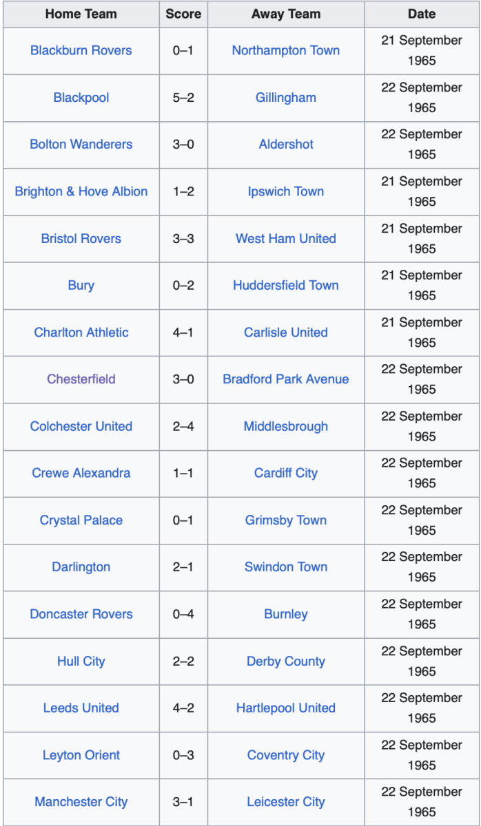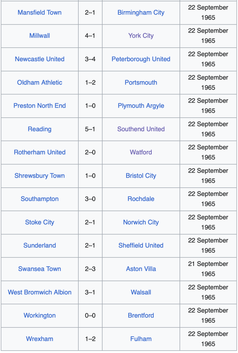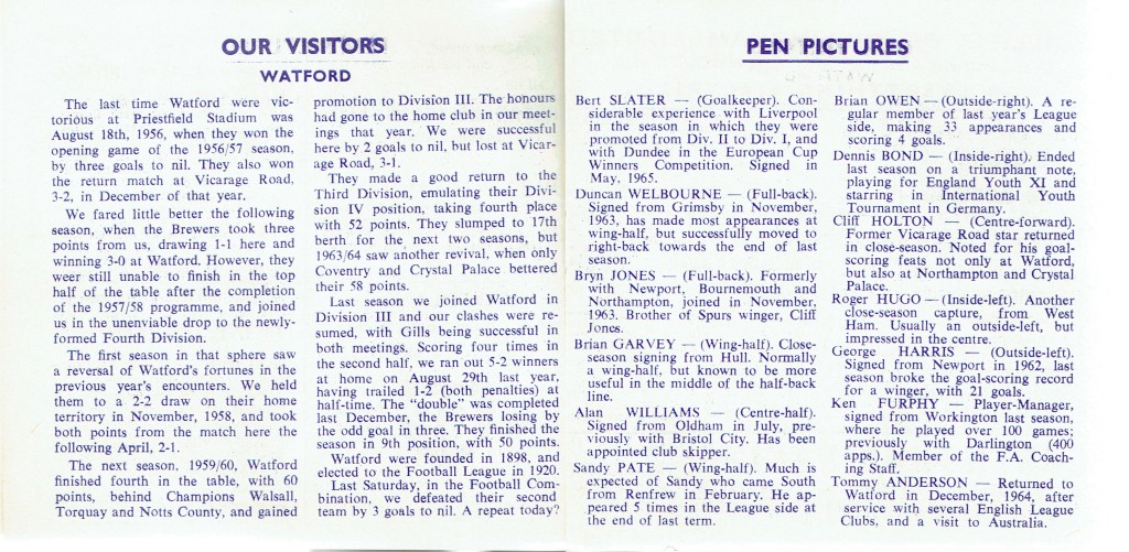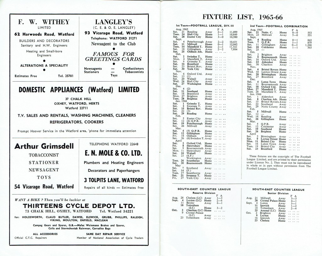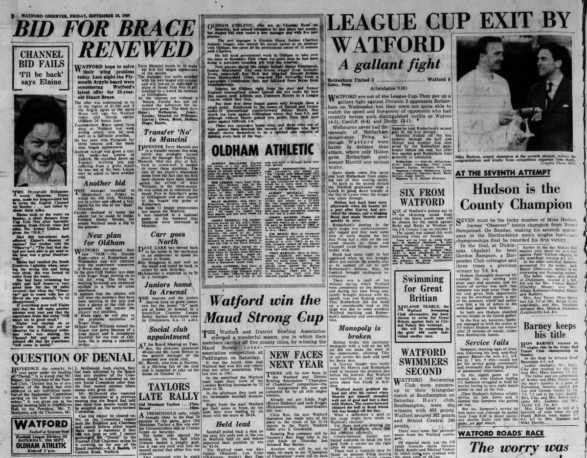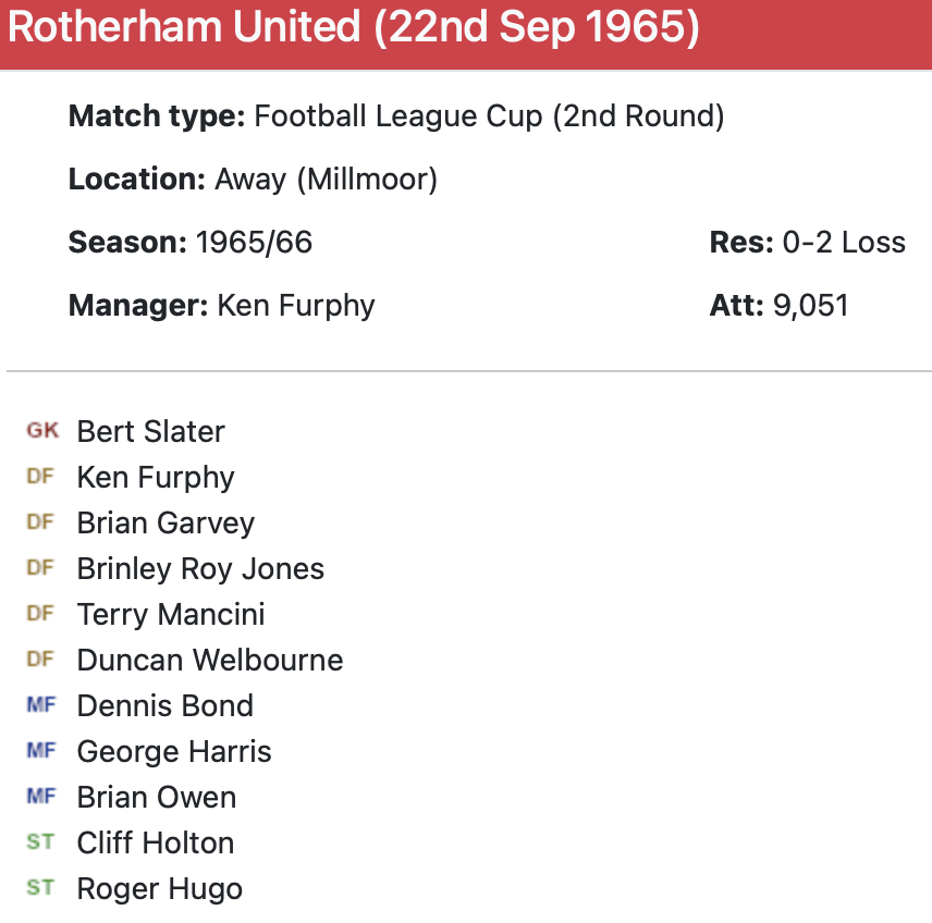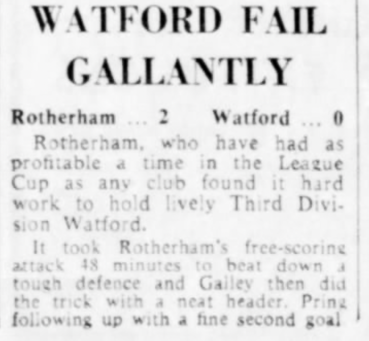 22nd September 1965- League Cup Second Round, Rotherham United 2 Watford 0 http://watford.fcdb.info/index.php?page=matches Daily Telegraph, 23 Sep 1965 Watford Observer match report https://en.wikipedia.org/wiki/1965–66_Football_League_Cup Share this: Share on X (Opens in new window) X Share on Facebook (Opens in new window) Facebook