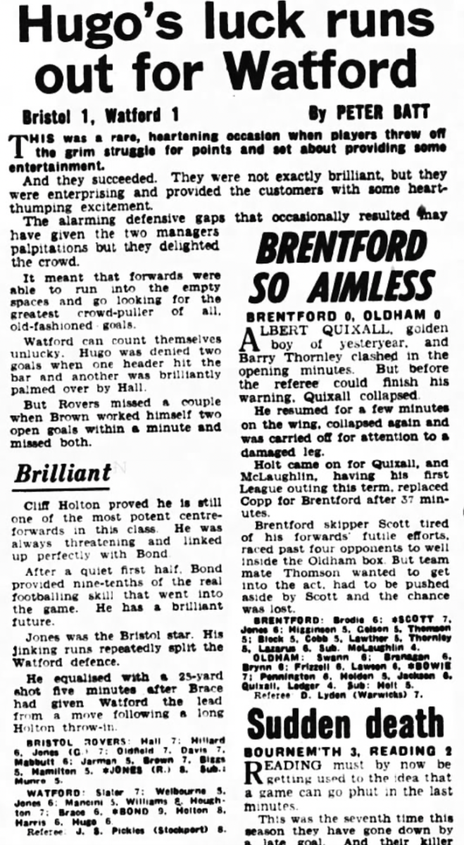 23rd October 1965- Division Three, Bristol Rovers 1 Watford 1 Leave a Reply http://watford.fcdb.info?id=2591 Sunday People, 24 Oct 1965 Watford Observer match report https://www.soccerbase.com/matches/results.sd?date=1965-10-23 https://www.11v11.com/league-tables/league-division-three/23-october-1965/ Share this: Share on X (Opens in new window) X Share on Facebook (Opens in new window) Facebook