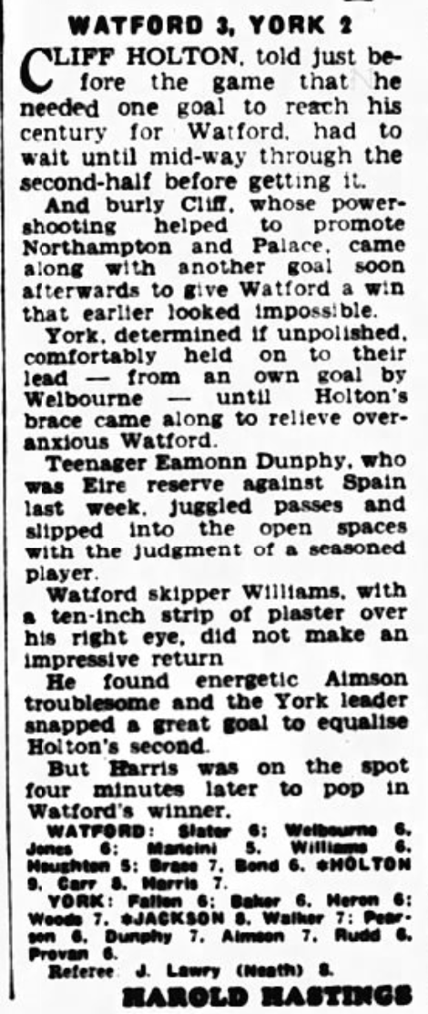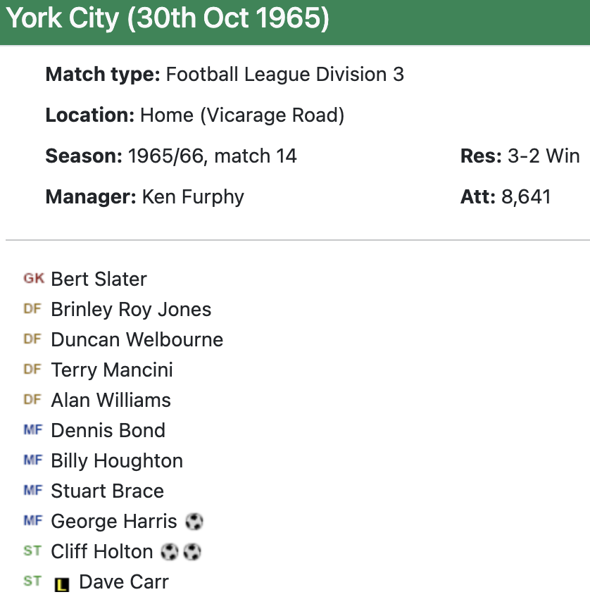 30th October 1965- Division Three, Watford 3 York City 2 https://watford.fcdb.info/index.php?page=matches Sunday People, 31 Oct 1965 Watford Observer match report https://www.soccerbase.com/matches/results.sd?date=1965-10-30 https://www.11v11.com/league-tables/league-division-three/30-october-1965/ Share this: Share on X (Opens in new window) X Share on Facebook (Opens in new window) Facebook