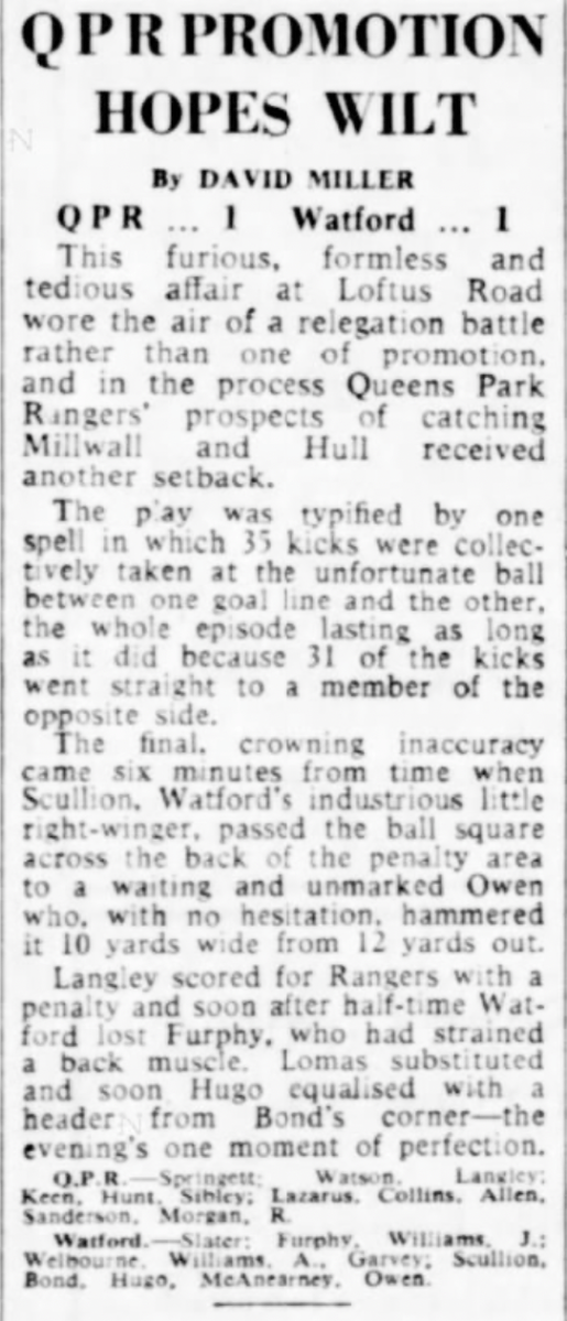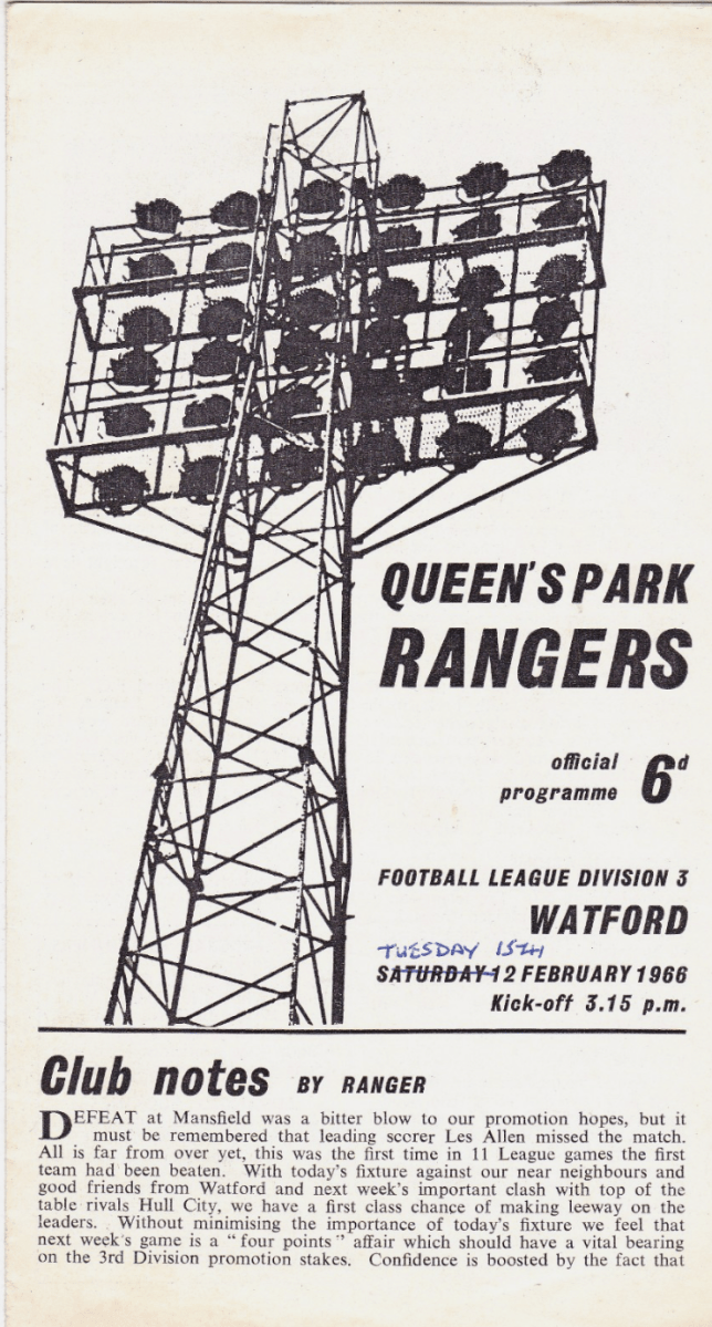 15th February 1966- Division Three, Queens Park Rangers 1 Watford 1 The game was postponed from the 12th February due to the condition of the Loftus Road pitch. http://watford.fcdb.info/index.php?page=matches Daily Telegraph, 16 Feb 1966 Watford Observer match report https://www.soccerbase.com/matches/results.sd?date=1966-02-15 https://www.11v11.com/league-tables/league-division-three/15-february-1966/ Share this: Share on X (Opens in new window) X Share on Facebook (Opens in new window) Facebook