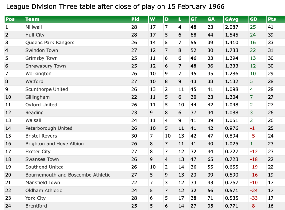 26th February 1966- Division Three, Millwall 0 Watford 0 Leave a Reply http://watford.fcdb.info/index.php?page=matches Sunday People, 27 Feb 1966 Sunday Mirror, 27 Feb 1966 Watford Observer match report https://www.soccerbase.com/matches/results.sd?date=1966-02-26 https://www.11v11.com/league-tables/league-division-three/26-february-1966/ Share this: Share on X (Opens in new window) X Share on Facebook (Opens in new window) Facebook