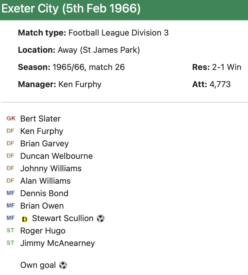5th February 1966- Division Three, Exeter City 1 Watford 2 Leave a Reply Watford Observer match report https://watford.fcdb.info/index.php?page=matches Sunday People, 6 Feb 1966 Sunday Mirror, 6 Feb 1966 https://www.soccerbase.com/matches/results.sd?date=1966-02-05 https://www.11v11.com/league-tables/league-division-three/05-february-1966/ Share this: Share on X (Opens in new window) X Share on Facebook (Opens in new window) Facebook