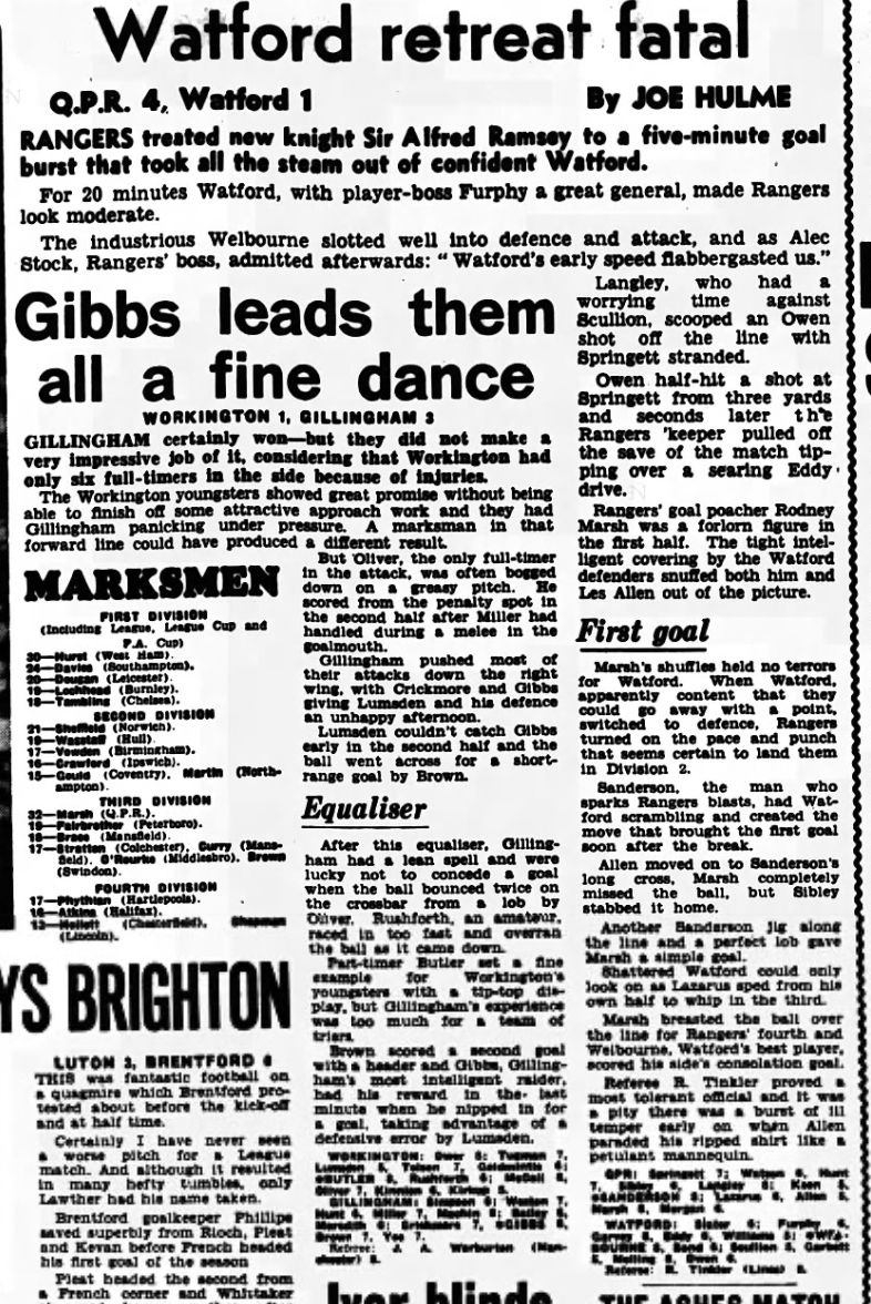 31st December 1966- Division Three, Queens Park Rangers 4 Watford 1 Leave a Reply https://watford.fcdb.info?id=2653&s=103291&p=1 Evening Standard, 31 Dec 1966 Sunday Mirror, 1 Jan 1967 Sunday People, 1 Jan 1967 Watford Observer match report https://www.soccerbase.com/matches/results.sd?date=1966-12-31 https://www.11v11.com/league-tables/league-division-three/31-december-1966/ Share this: Share on X (Opens in new window) X Share on Facebook (Opens in new window) Facebook