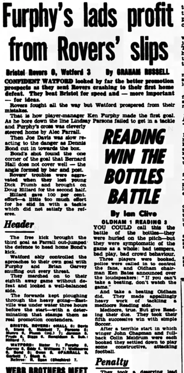 10th December 1966- Division Three, Bristol Rovers 0 Watford 3 Leave a Reply http://watford.fcdb.info?id=2649 Evening Standard, 10 Dec 1966 Sunday Mirror, 11 Dec 1966 Sunday People, 11 Dec 1966 Watford Observer match report https://www.soccerbase.com/matches/results.sd?date=1966-12-10 https://www.11v11.com/league-tables/league-division-three/10-december-1966/ Share this: Share on X (Opens in new window) X Share on Facebook (Opens in new window) Facebook